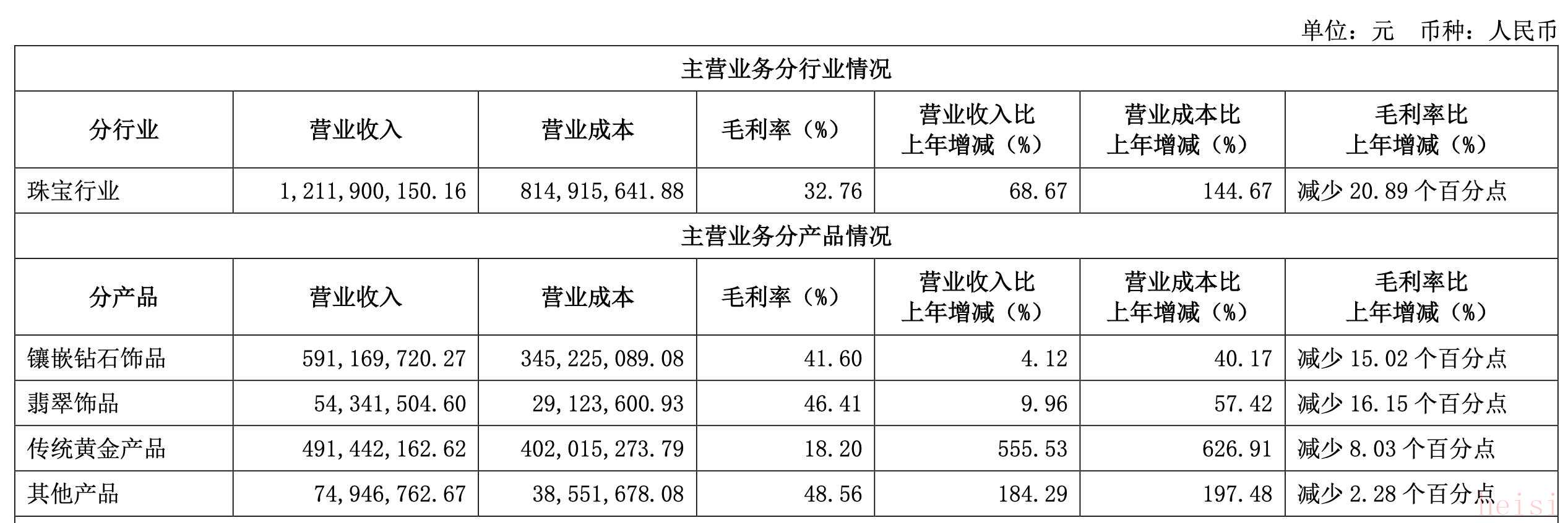 資料顯示,萊紳通靈主要從事珠寶首飾的品牌運(yùn)營管理、產(chǎn)品設(shè)計研發(fā)及零售,品類涵蓋黃金、鉆石、珍珠、翡翠等。從其珠寶業(yè)務(wù)的具體數(shù)據(jù)來看,去年營業(yè)收入為12.12億元,同比增長68.67%,但營業(yè)成本卻同比增長144.67%,成本大幅增長直接導(dǎo)致了毛利率的下降,僅為32.76%,比上年減少20.89個百分點(diǎn)。