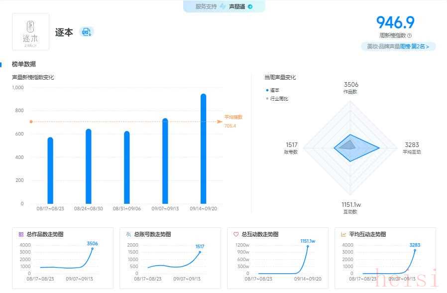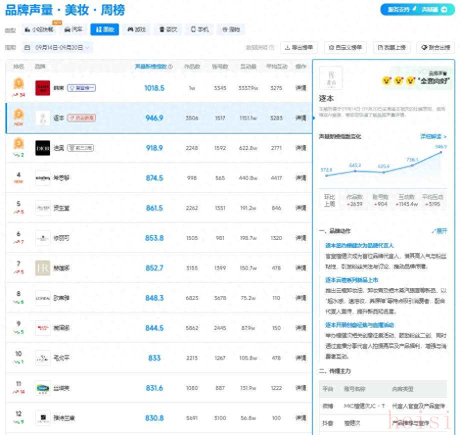 新榜品牌聲量?美妝周榜(09 月 14 - 09 月 20 日)發(fā)布,逐本以 946.9 的聲量新榜指數(shù)躍居第二。環(huán)比上周,作品數(shù)增加 2659 ,互動量飆升 1143.4w ,憑借一系列亮眼的品牌動作,在競爭激烈的美妝市場中迅速崛起。