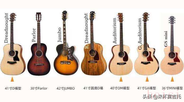 1. "體型與預算:" 先確定自己的預算范圍,并考慮自己是否需要便攜性(旅行吉他)。吉他主要分為民謠(Acoustic)、古典(Classical)、電吉他(Electric)和吉他合成器(Acoustic Synthesizer)。這里主要推薦適合入門的民謠和古典吉他。