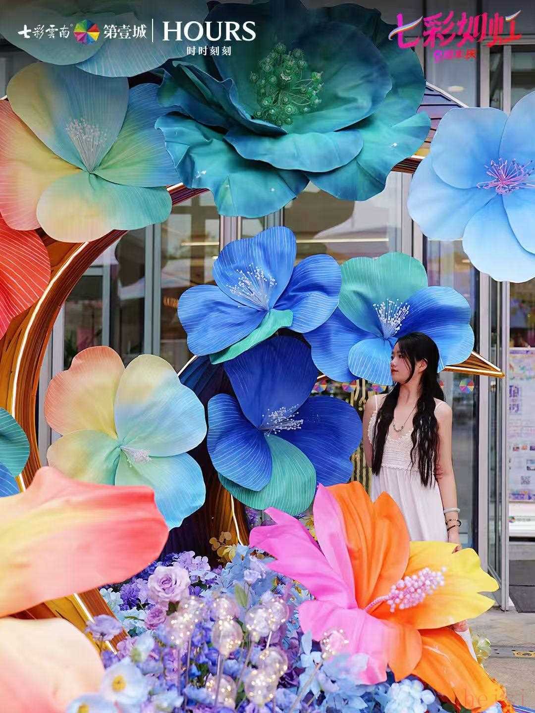 這不是普通的打卡布景,而是一場(chǎng)聚焦“連接”主題的在地性實(shí)驗(yàn)。裝置通過(guò)9道漸變色弧光重新構(gòu)建空間敘事——赤色汲取自紅土地的熾熱激情、橙色映照晚霞中滇池的粼粼波光、黃色源自傣家筒裙上的金色刺繡、綠色演變?yōu)橛炅謱哟蔚募?xì)膩呼吸、青色沉淀為普洱茶湯的清澈透亮、藍(lán)色倒映洱海月夜的寧?kù)o安詳、紫色幻化為藍(lán)花楹落花的浪漫氣息。