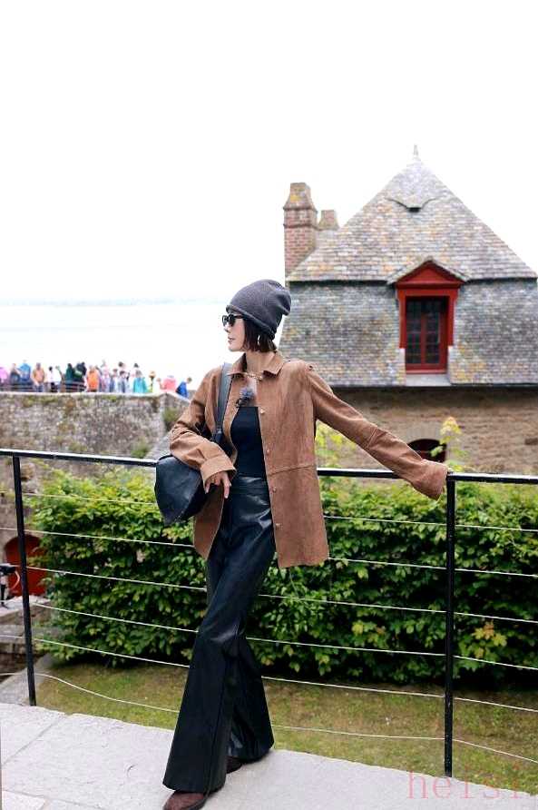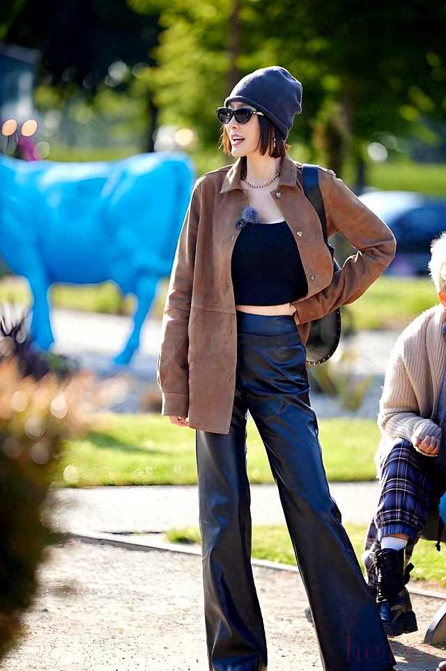 她把下擺隨意塞進(jìn)褲腰,只塞前半片,后片蓋到臀部最寬點,再配同色靴子,褲靴一體把腿拉到兩米八。