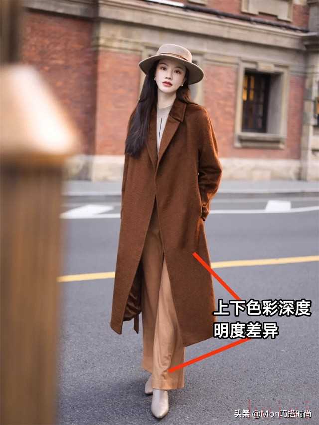 這就是大地色典型的同色系運用。大衣選擇了更加顯白提氣色的卡其色,與深棕色的闊腿褲構成上淺下深的配色,小個子女生也能輕松駕馭。