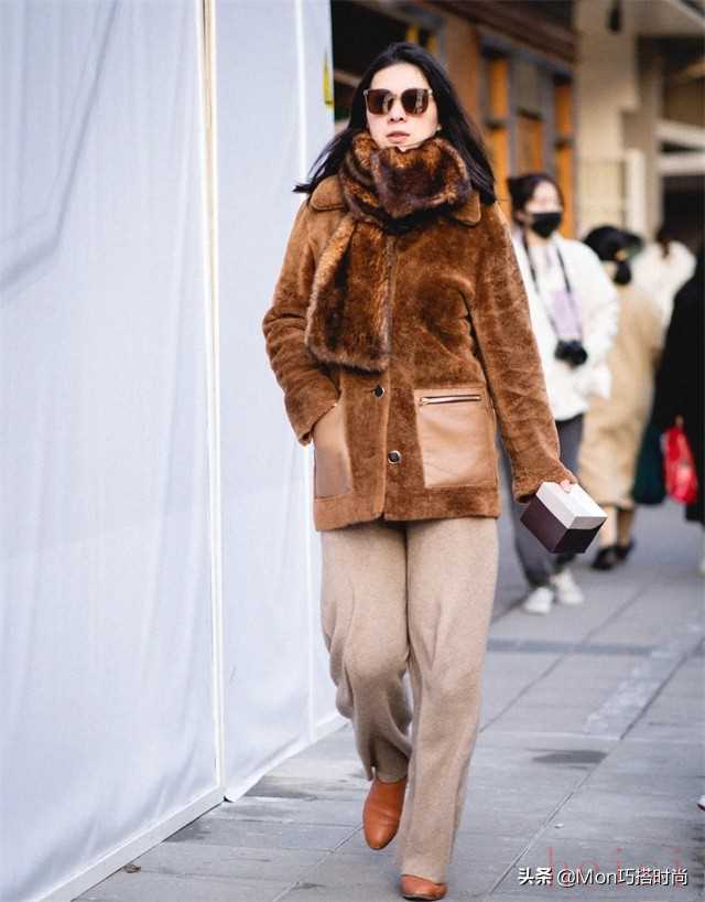 皮草中長款大衣結合皮質拼接設計,奢華中透露出幾分設計感。配上淺棕色針織闊腿褲,溫柔得體,氣場全開。