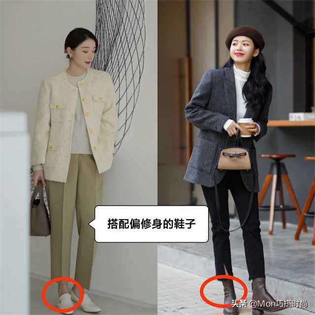 九分長的褲子不適合選擇褲腿過于寬松的設計,適合搭配大衣的通常為褲腳偏窄的褲型,這種褲型不適合搭配過于笨重的鞋子,選擇上面這些偏修身的鞋子會更好看。
