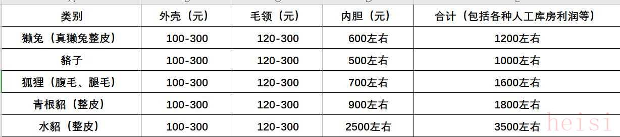 最典型的例子就是水貂,好的水貂,是不會用來做派克服內(nèi)膽的,因為得不償失,好的水貂更多是用來做貂皮大衣,那樣才是物盡其用。一件貂皮大衣少則3-5千,貴的上萬的也非常多。當然個人定制的派克服內(nèi)膽是另當別論,廠家會根據(jù)客戶的要求來制作,畢竟有需求就會有市場。按照價格高低來排序的話,水貂>青根貂>狐貍>獺兔>貉子。