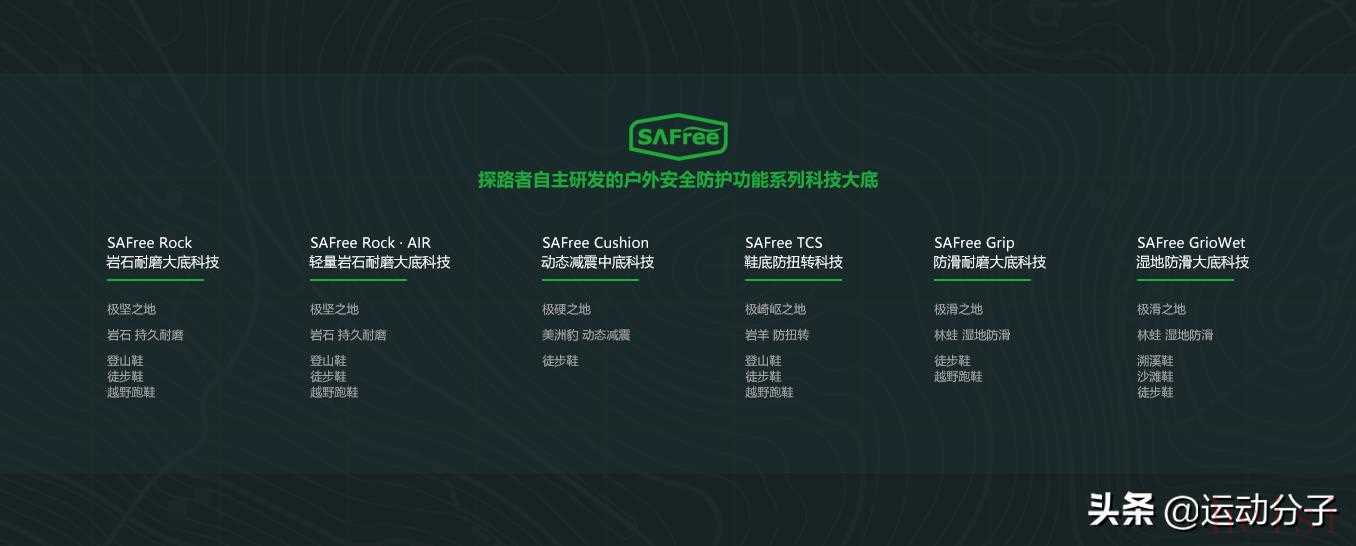 探路者有不少使用vibram底的鞋款,這四雙用的全是自家的SAFree(綠標)。與vibram一樣,SAFree同樣有一整套的外底材質(zhì)/技術細分。