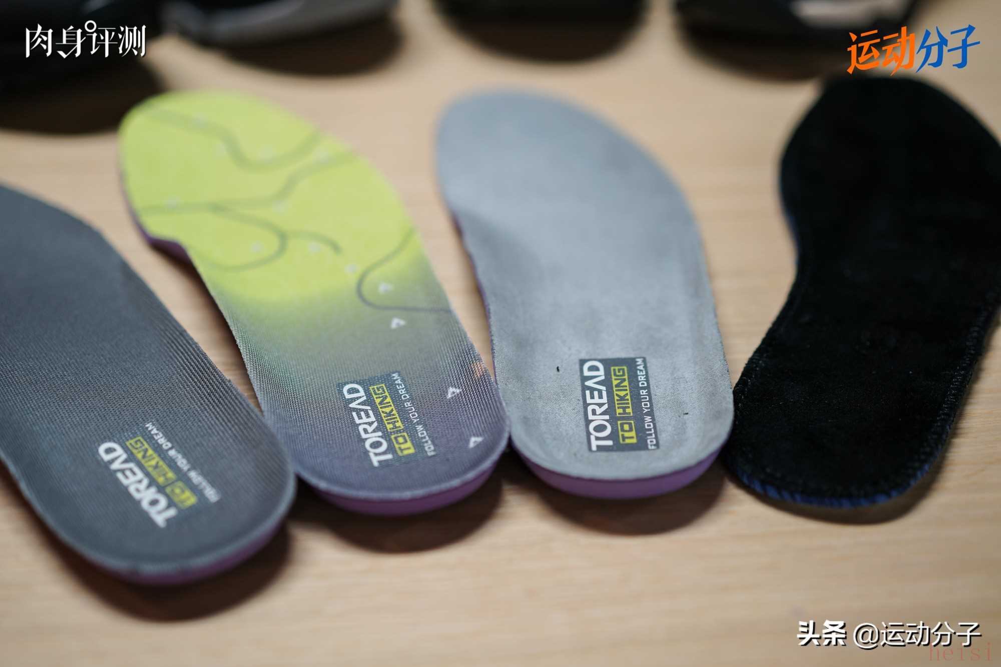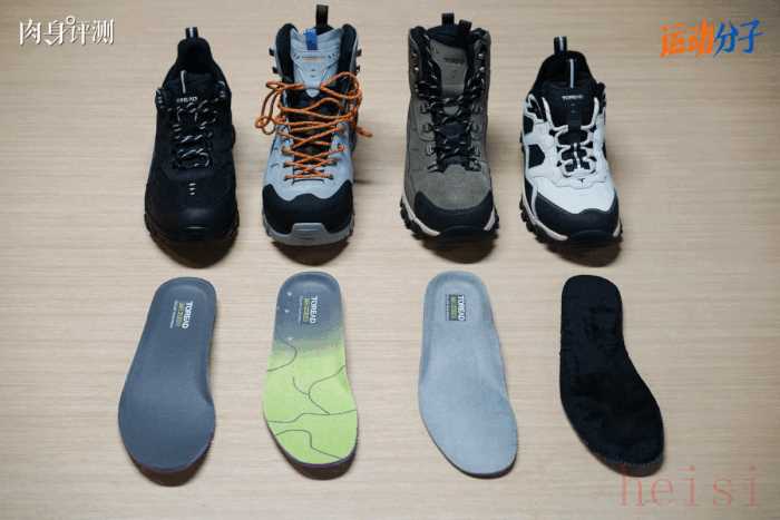 另外,登山靴的鞋墊往往在中后跟部位有額外加固(有點像矯正鞋墊),來提高穩(wěn)定性及對足底的支撐,這四雙鞋都是接近運動鞋的鞋墊,也說明它們徒步為主、兼顧戶外登山,但與真正登山靴還是有區(qū)別。這同樣也算選鞋時值得關注的細節(jié)。