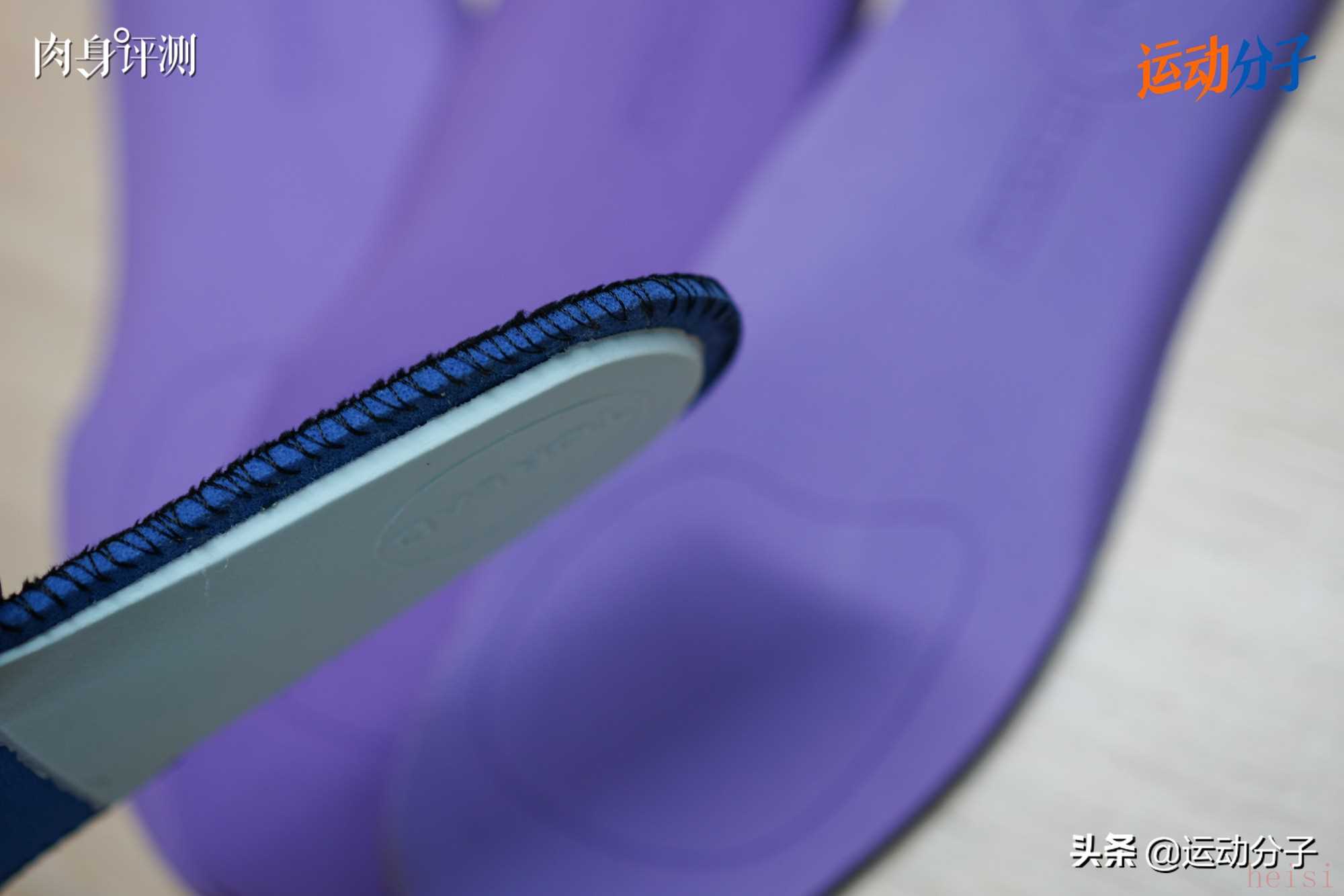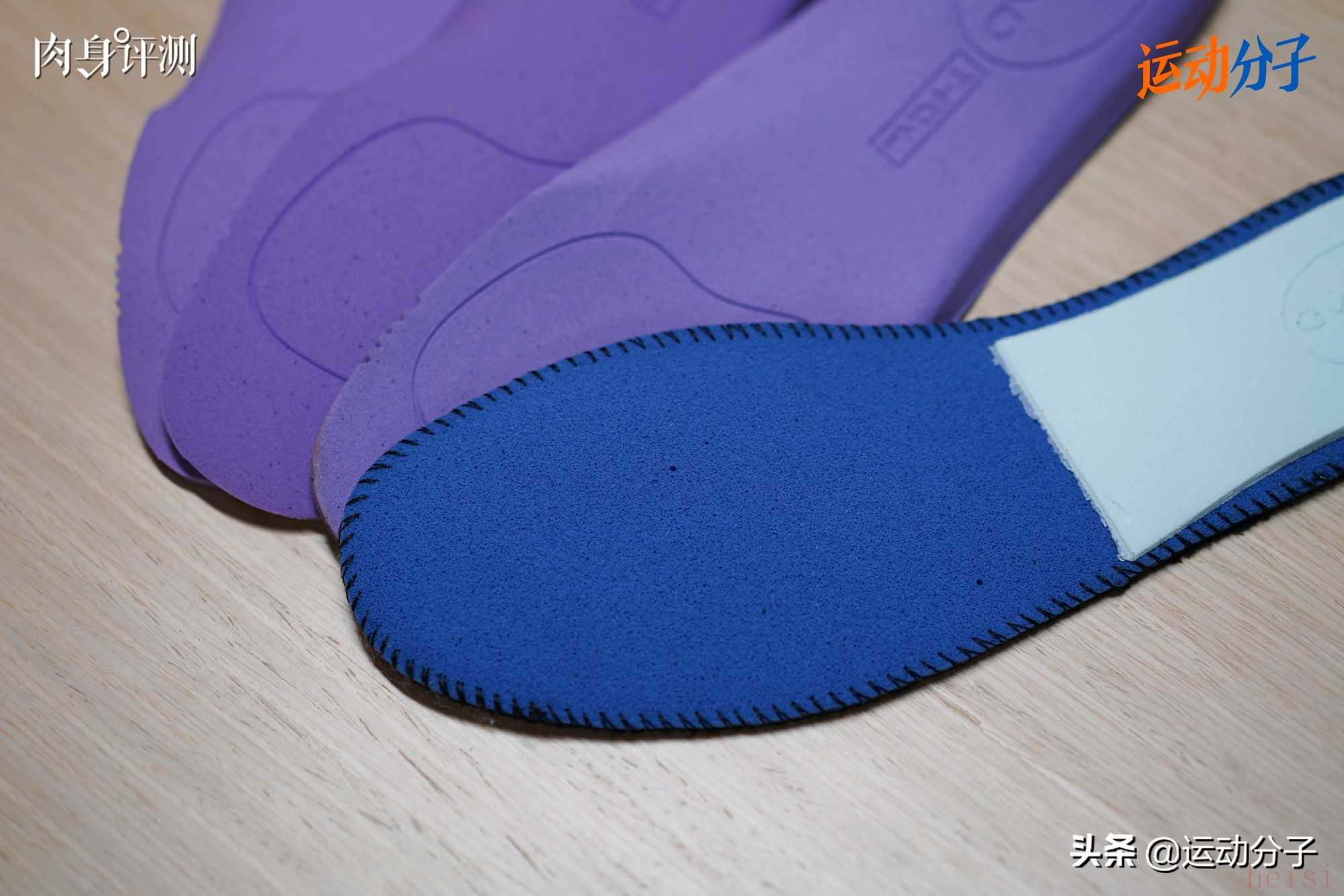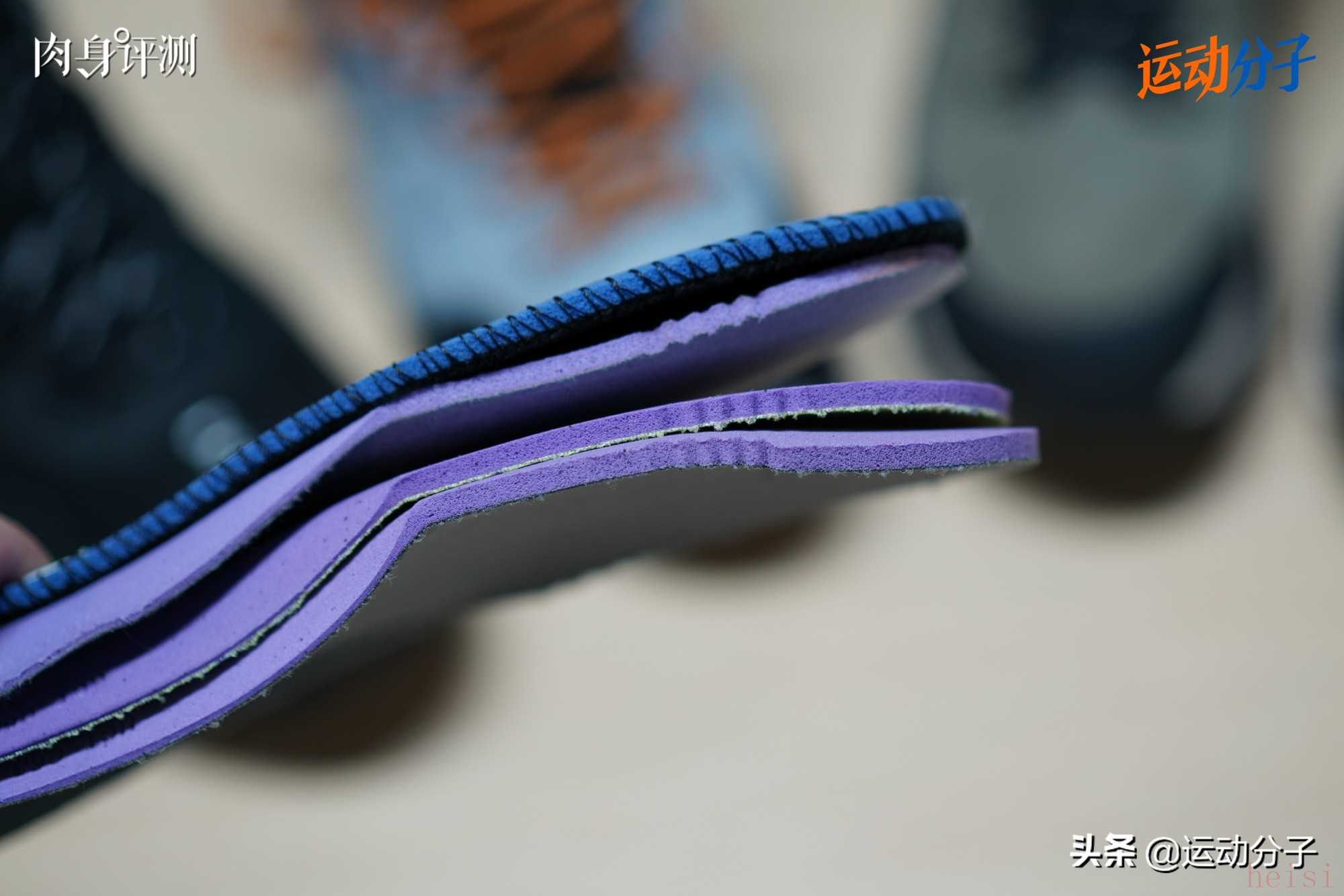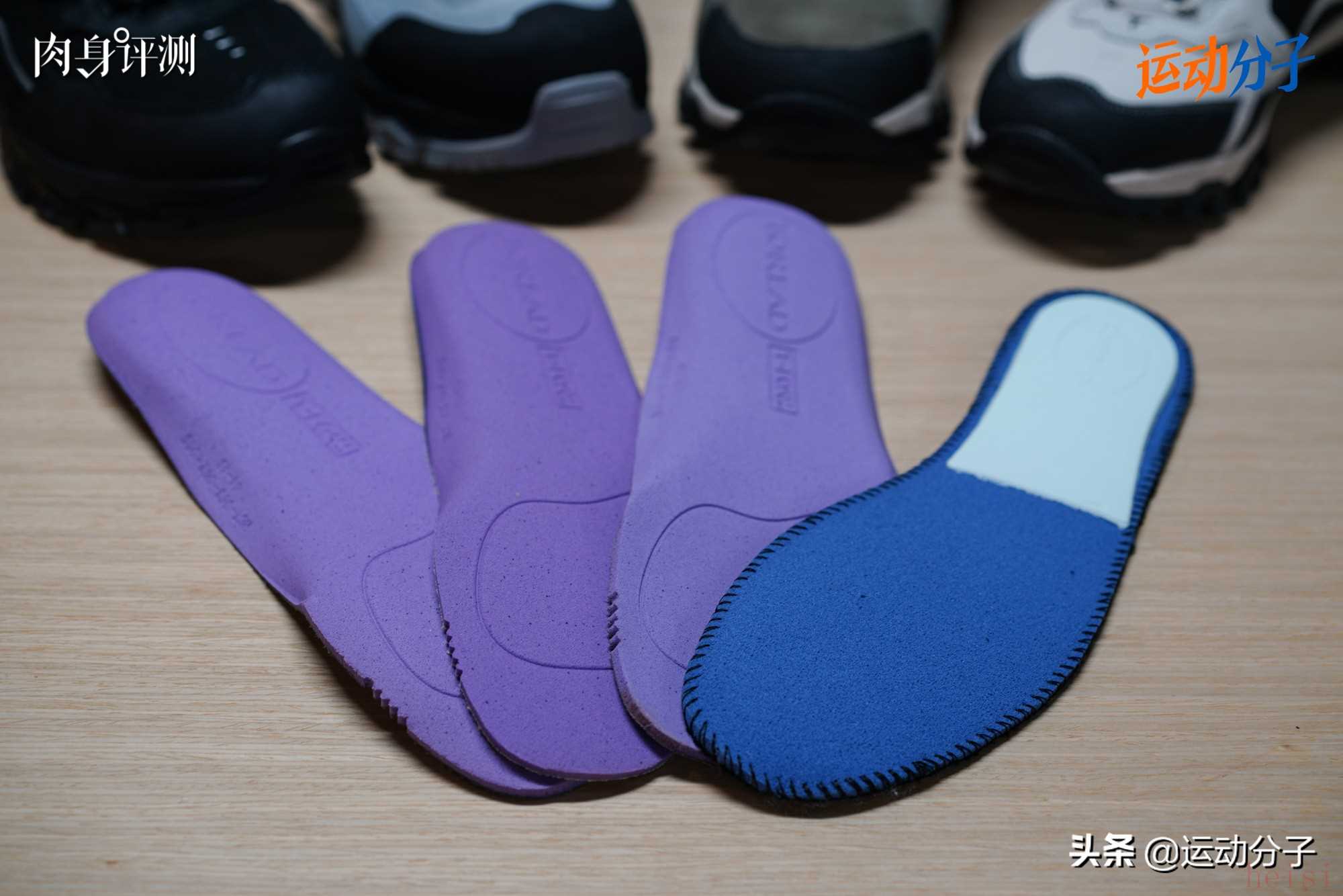 四雙中有個異類,也正好是我們覺得值得點贊的設計——加絨的鞋墊顯然有更高的保暖性(整雙鞋內(nèi)里都加絨,很明顯的冬季用鞋),但加絨后腳部更容易出汗,對排汗性要求也更高/更容易捂腳,因此藍色鞋墊細看,其開孔發(fā)泡的網(wǎng)眼更大、鞋墊的密度更低(透氣性吸汗性更好)。所以比紫色的要更軟一些,這就減弱了一些彈性/緩震性。因而它的后跟部位增加了一片緩震,算是腳感的補充。