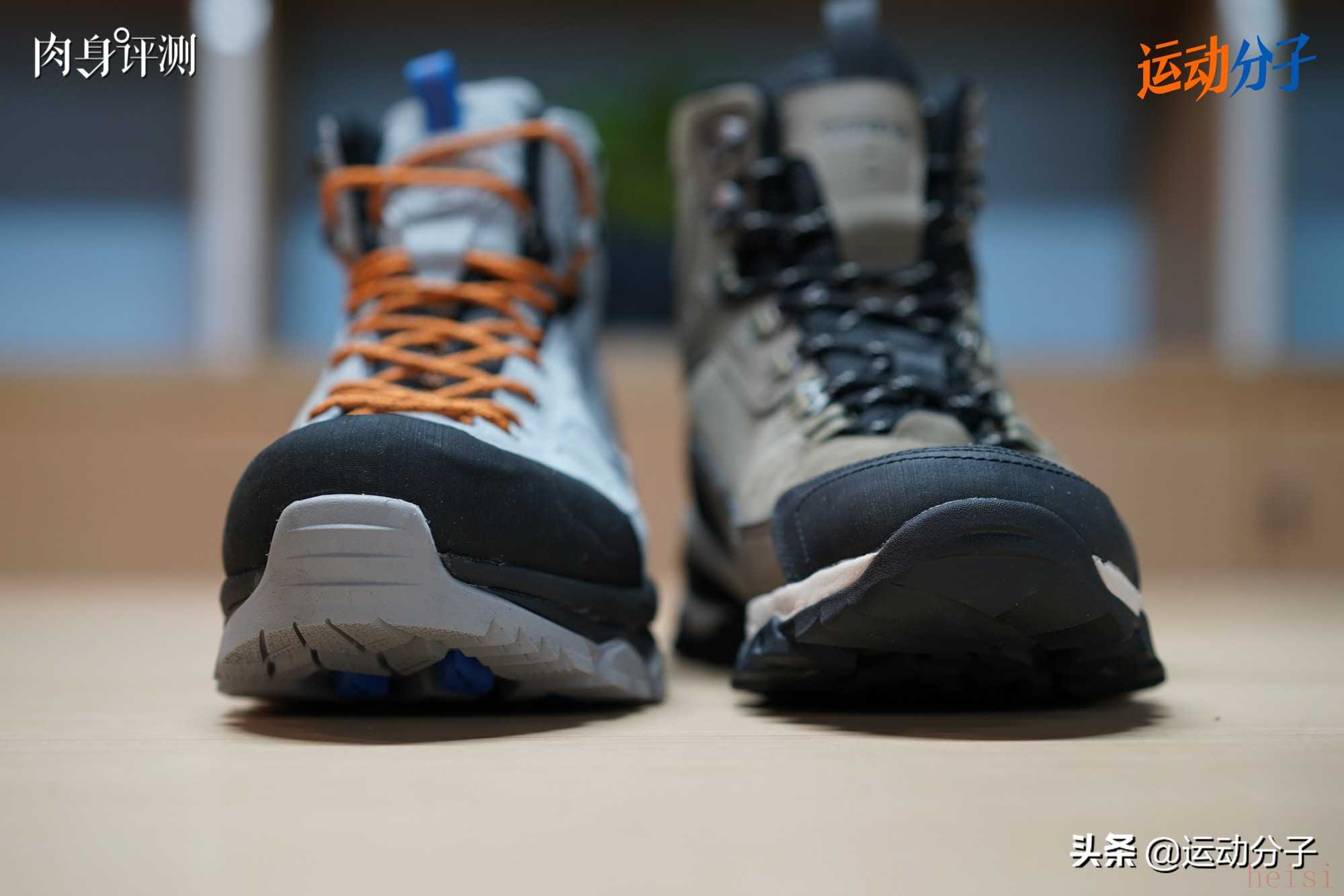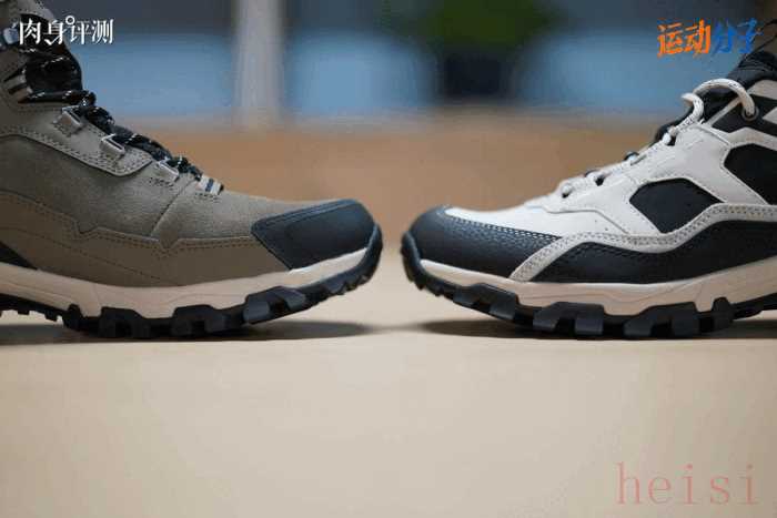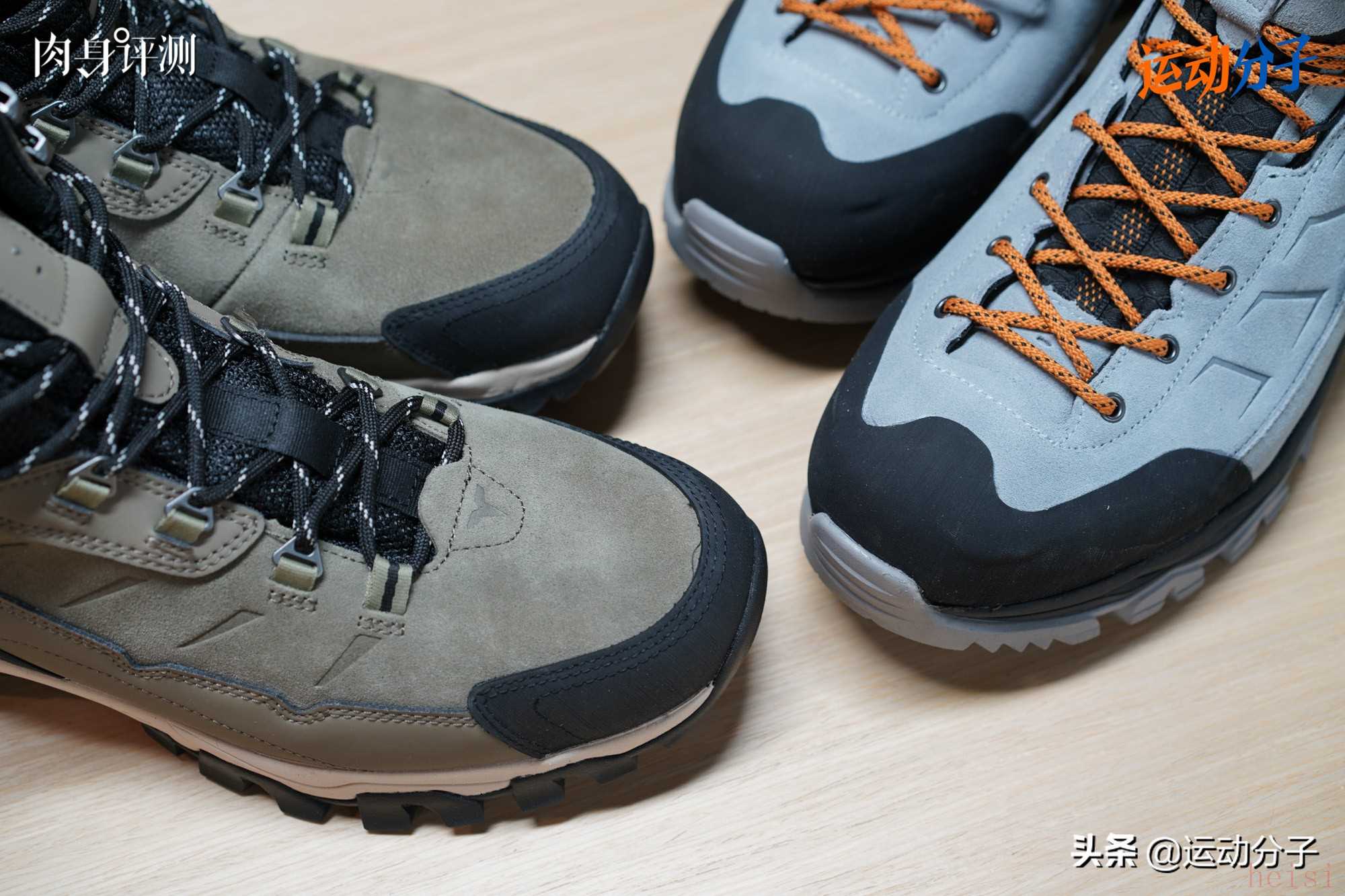 兩款高幫鞋鞋幫位置都有兩個繞繩式鞋帶扣——區(qū)別于穿孔式,繞繩式能在包裹緊縛同時,不至于過于壓迫腳背/腳踝,會更借助聚攏鞋面、而非鞋帶直接束縛于腳背。同時顯然也更容易穿脫。繞繩式鞋帶扣的成本很高,判斷戶外鞋款做工時,摸一摸鞋帶扣(比如是否有毛刺、表面的質(zhì)感),也是評估品質(zhì)的一個細節(jié)。