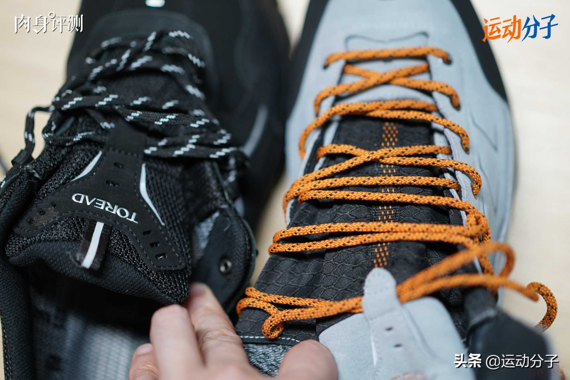 戶外鞋的鞋面偏重支撐性和保護性,在開始之前我們也尤為建議,花點時間調(diào)整鞋帶,以獲得最舒適的腳感。幾雙鞋鞋帶看起來都差不多,實際穿著中發(fā)現(xiàn),全黑低幫的鞋帶,摸起來表面顆粒起伏,和如今部分跑鞋上常見的防散鞋帶很類似。稱得上加分項(這雙全黑低幫確實也是我們認為綜合性能與性價比最高的一雙)。