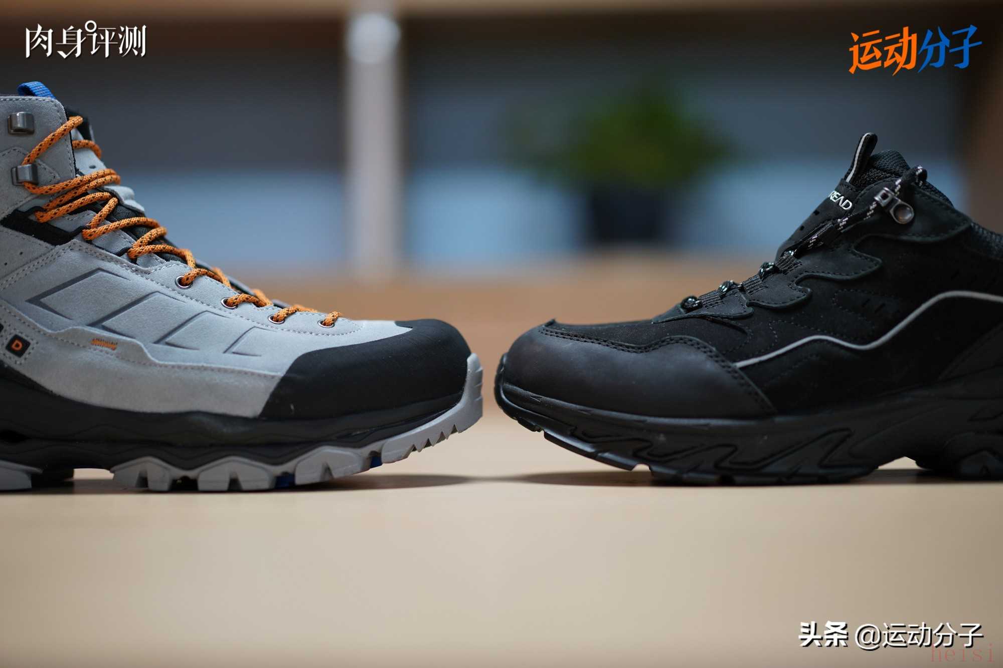 留意下圖腳趾下方的一個細節(jié)。左邊高幫的外底橡膠更厚,有鋸齒狀紋路,右邊低幫橡膠更薄,紋路平整——高幫鞋款更針對高海拔或重裝徒步,因而更厚的橡膠除了耐磨度,也有降低起伏硬石路面穿刺感的效果。但更厚的外底難免喪失靈活性,腳趾部位的鋸齒除了增加抓地力外,最主要就是提升可曲折度。相應的,更薄的低幫款會有更強的路面感,也更合適平坦路面/泥土路的徒步。