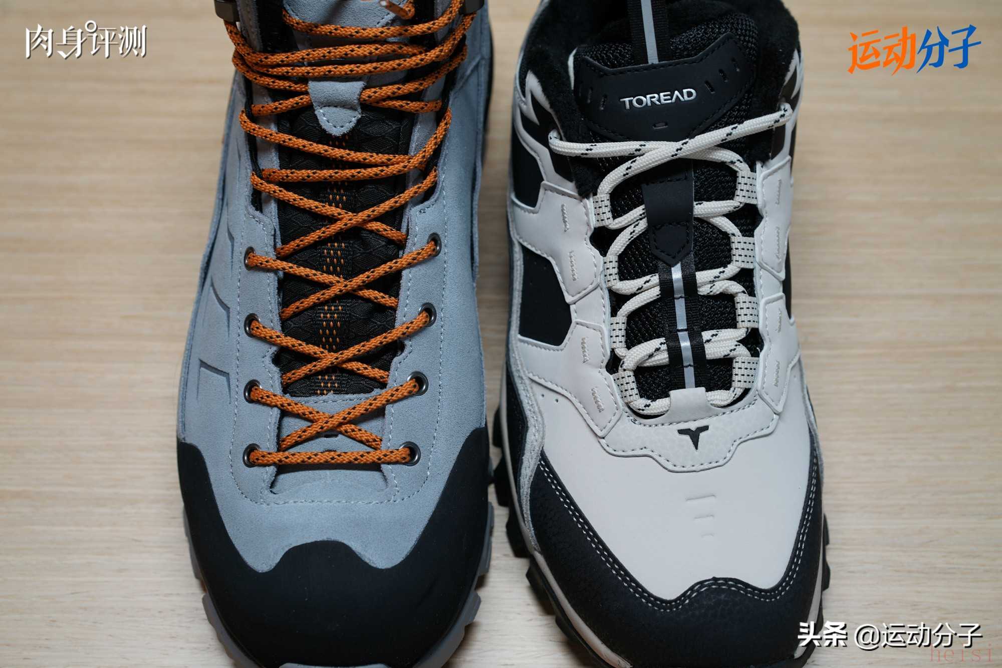 尤其留意下圖左側(cè)這雙的鞋帶,其鞋帶孔數(shù)量更多、且延至鞋頭腳趾部位。這種設計通常在重裝徒步鞋/高山靴/攀巖鞋等上尤為常見——更多的的鞋帶孔及更長的可調(diào)節(jié)區(qū)域,意味著鞋子前掌的松緊寬窄度可調(diào)節(jié)性更高,前面提到的幾類戶外鞋,也都是對前掌的包裹及舒適度要求很高的專業(yè)用鞋;另外一點,登山及長時間徒步,腳部尤容易充血發(fā)漲(這也是戶外鞋常需考慮買大半碼的原因),更多鞋帶孔就能更方便的去穿脫。