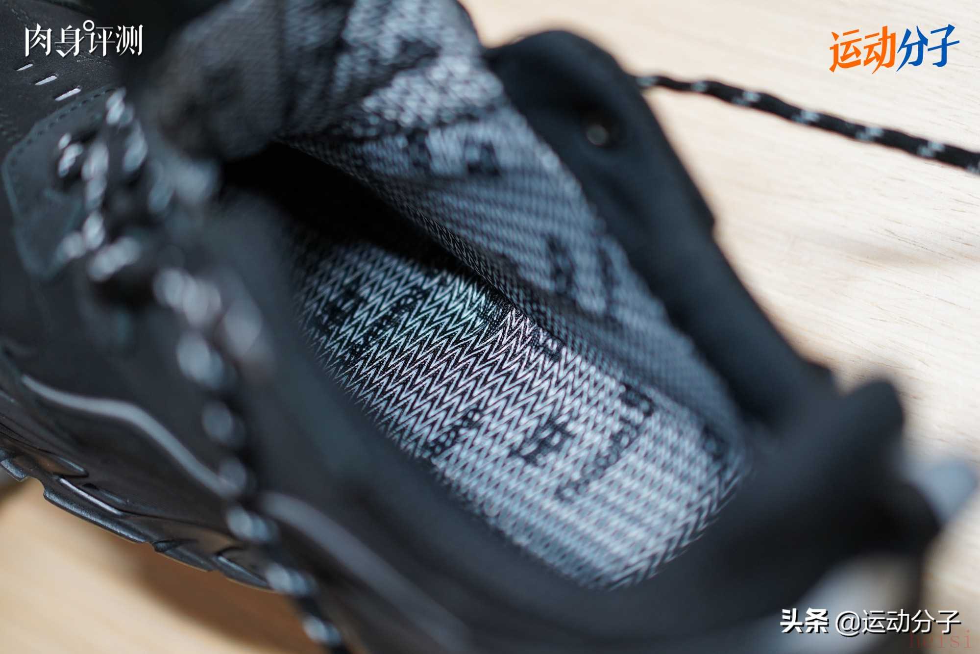 整雙鞋的內(nèi)里容易進水部位都被GORE-TEX面料包裹,形成一個類似襪套結構的封閉環(huán)境,溯水時液體就被這層襪套阻擋,無法進入鞋靴內(nèi)部,而行走中雙腳產(chǎn)生的濕氣則可以正常排出鞋面。