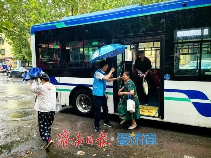 公交志愿者在K2路、K45路、K91路終點(diǎn)站給乘客送雨衣,攙扶老人下車。