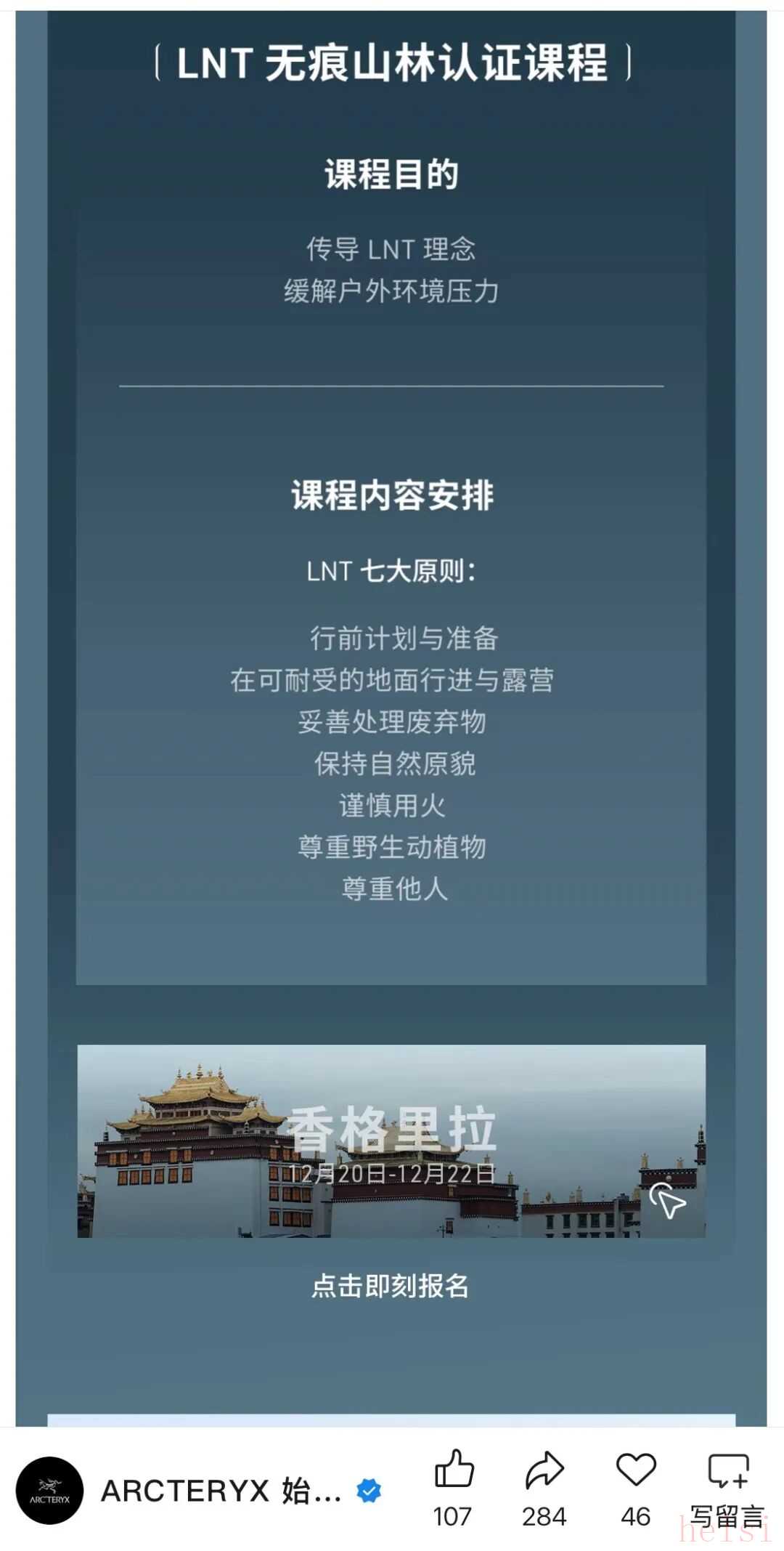 無(wú)痕山林(Leave No Trace,LNT),簡(jiǎn)稱LNT,是始于美國(guó)的一種戶外運(yùn)動(dòng)方式,旨在提醒人們?cè)谧匀恢谢顒?dòng)時(shí),關(guān)注并身體力行地保護(hù)與維護(hù)當(dāng)?shù)氐纳鷳B(tài)環(huán)境。據(jù)始祖鳥(niǎo)官方微信公眾號(hào)信息,其去年底還在香格里拉開(kāi)展過(guò)相關(guān)課程。