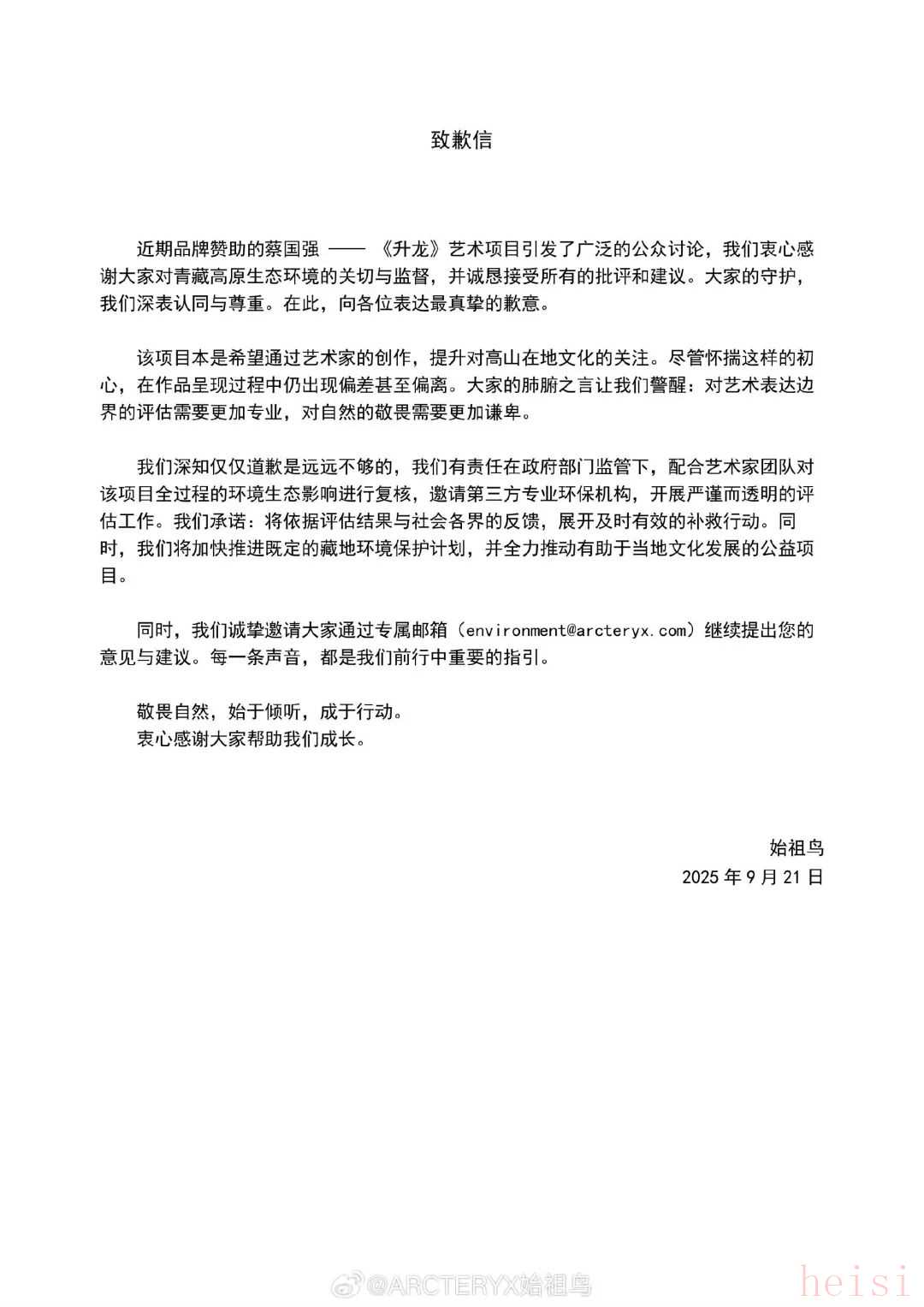 始祖鳥(niǎo)也于9月21日早晨發(fā)布致歉聲明,稱“誠(chéng)懇接受所有批評(píng)和建議”“對(duì)自然的敬畏需要更加謙卑”,并承諾“將依據(jù)評(píng)估結(jié)果,展開(kāi)及時(shí)有效的補(bǔ)救行動(dòng)”。就此次爭(zhēng)議事件,有意思報(bào)告聯(lián)系始祖鳥(niǎo)中國(guó)尋求進(jìn)一步回應(yīng),但截至發(fā)稿未獲回復(fù)。