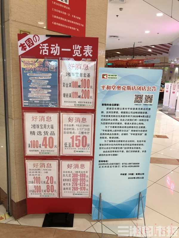 近日,該商場(chǎng)在門店多個(gè)主入口擺放了閉店公告易拉寶,稱根據(jù)公司戰(zhàn)略調(diào)整部署,平和堂奧克斯店及其超市將于2020年4月1日正式閉店終止經(jīng)營(yíng),消費(fèi)者包括平和堂會(huì)員積分在內(nèi)的所有會(huì)員權(quán)益將繼續(xù)使用,可以在平和堂任意門店享受會(huì)員服務(wù)。
