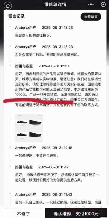 李戈稱,由于國內(nèi)專柜不能維修,她就聯(lián)系了始祖鳥全球客服,得知維修費(fèi)需要1000元?!暗@雙鞋子買的時候差不多1200元,所謂全球服務(wù)竟成了花高價自費(fèi)維修?!?/p>