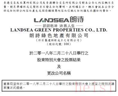 根據(jù)公告內(nèi)容,朗詩綠色地產(chǎn)在特別股東大會上針對2017年12月提出的更改企業(yè)名稱的決議案以投票方式進行表決,并以100%贊成的結(jié)果獲得通過。此次更名決議得到批準(zhǔn)后,企業(yè)的英文名稱由“LandseaGreen Properties Co. Ltd.”更改為“Landsea Green Group Co.Ltd.”,并采納“朗詩綠色集團有限公司”為公司的中文第二名稱,以取代其現(xiàn)有中文第二名稱“朗詩綠色地產(chǎn)有限公司”。