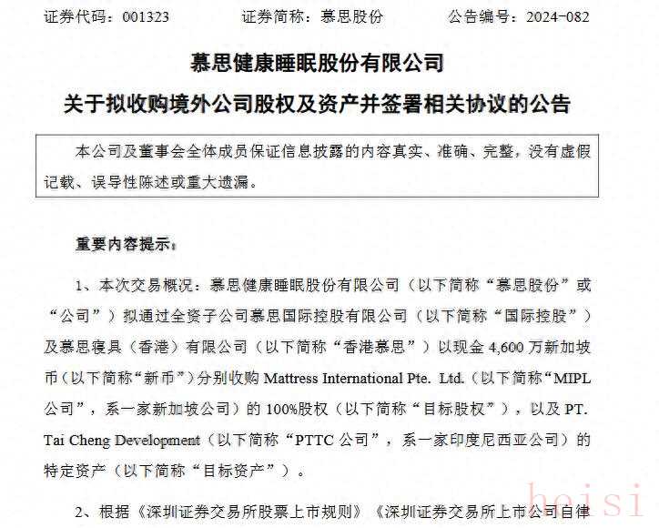 12月18日,慕思股份(001323.SZ)發(fā)布公告稱(chēng),公司擬以4600萬(wàn)新加坡幣(折合約人民幣2.47億元)分別收購(gòu)一家新加坡家居企業(yè)100%的股權(quán)以及該公司制造商的特定資產(chǎn)。
