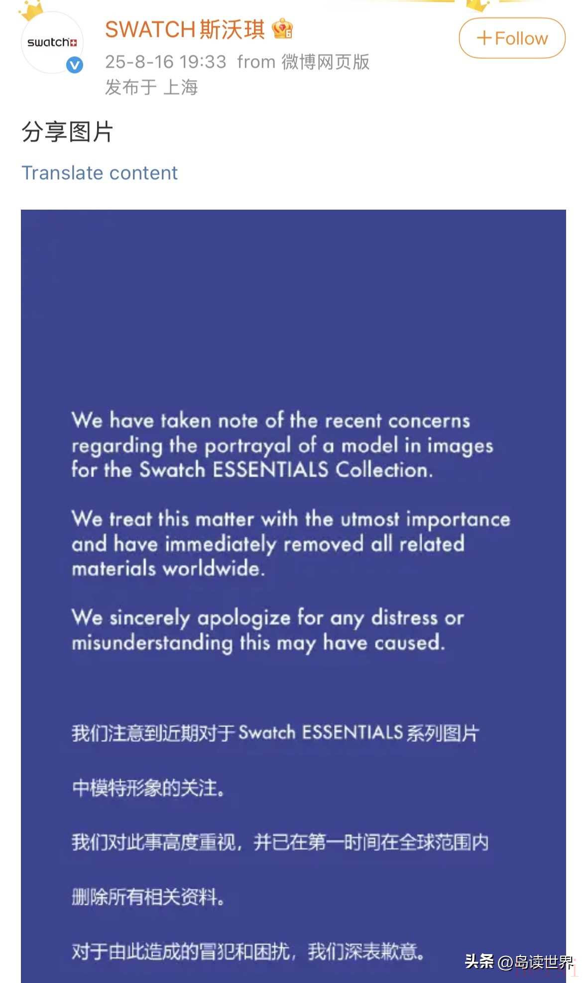 面對持續(xù)攀升的輿論壓力,Swatch上星期六(8月16日)在微博發(fā)布聲明,就此事造成的冒犯和困擾道歉,并稱已在全球范圍內(nèi)第一時(shí)間刪除相關(guān)內(nèi)容。