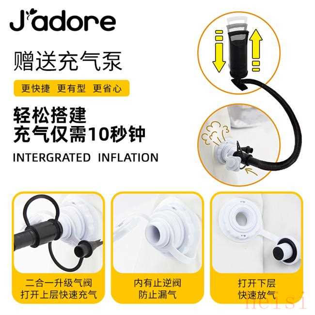 J'adore兒童充氣帳篷,采用皮劃艇同款氣閥,搭建過(guò)程簡(jiǎn)單快捷,10秒快速充氣,3秒快速放氣,只需使用充氣泵或手動(dòng)充氣即可迅速成型,省去了傳統(tǒng)帳篷繁瑣復(fù)雜的搭建步驟。充氣帳篷通過(guò)氣體壓強(qiáng)特性將氣囊膨脹形成具有一定剛性的一體式柱體,具有良好的穩(wěn)定性,其主體面料采用600D高品質(zhì)牛津布,這種透氣阻燃面料不僅柔軟親膚更耐磨易清洗。在抗撕裂、抗拉伸方面表現(xiàn)優(yōu)異,且具有較好的防水性能,使得J'adore兒童充氣帳篷無(wú)論是在晴朗的戶外探險(xiǎn),還是偶遇風(fēng)雨的突發(fā)狀況,都能成為孩子們值得信賴的避風(fēng)港。