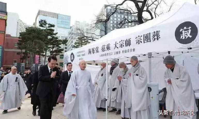 大型祭祀現(xiàn)場(chǎng)。也怪不得韓國(guó)人念舊,家里有人去世,靈堂必須擺出漢字挽聯(lián)。總統(tǒng)夫婦出席法師葬禮,周?chē)菨h字,每走一步就是一場(chǎng)文化的“碰壁”,沒(méi)辦法假裝那些過(guò)去從來(lái)沒(méi)出現(xiàn)過(guò)。官方儀式呼應(yīng)著民間習(xí)慣,這種自發(fā)的“漢字復(fù)活”,誰(shuí)能攔得???