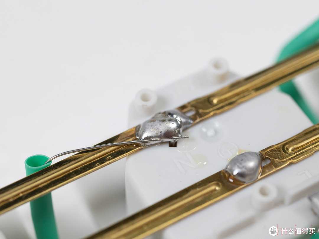 一體銅片很有光澤,有環(huán)形設(shè)計(jì),環(huán)形上面還有壓槽。銅排與開(kāi)關(guān)之間是穿孔加焊錫固定,焊點(diǎn)飽滿(mǎn),做工真的很可以。