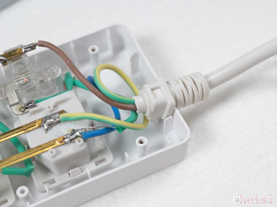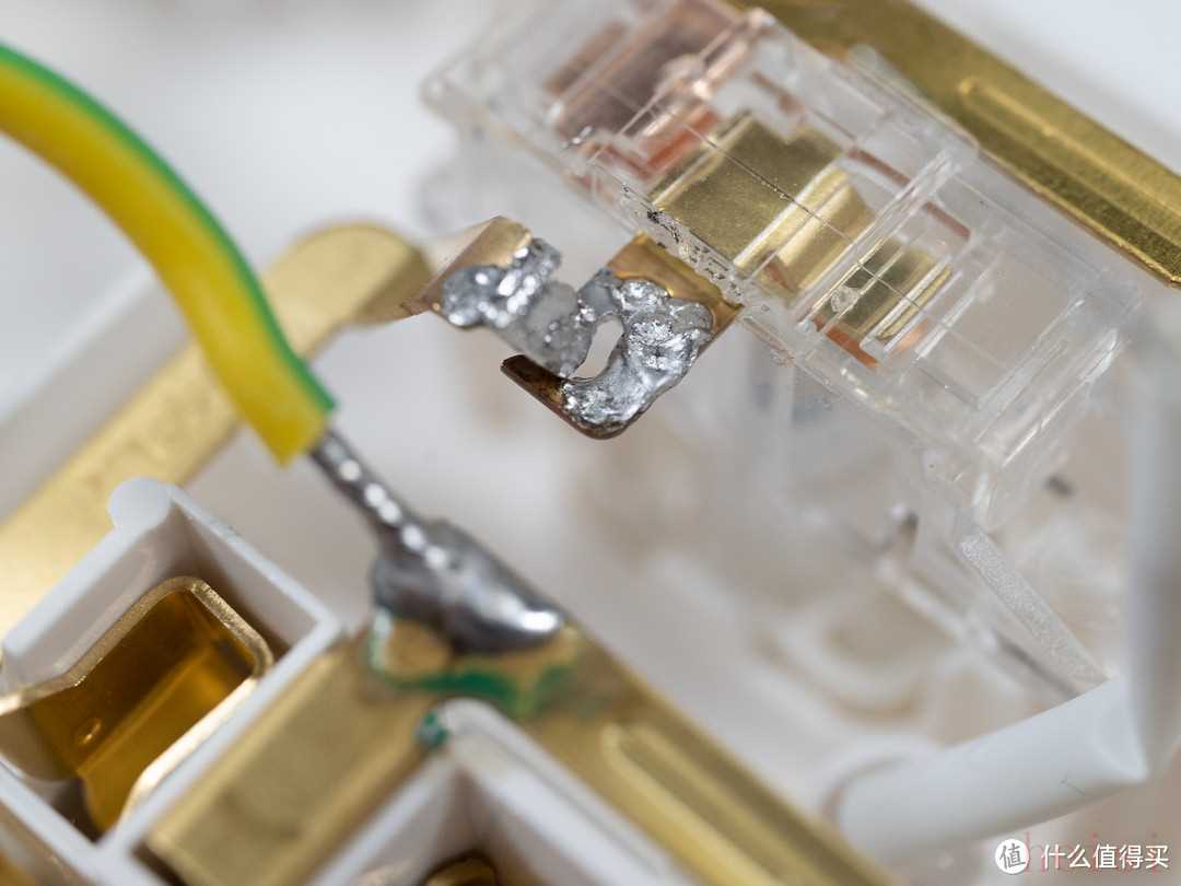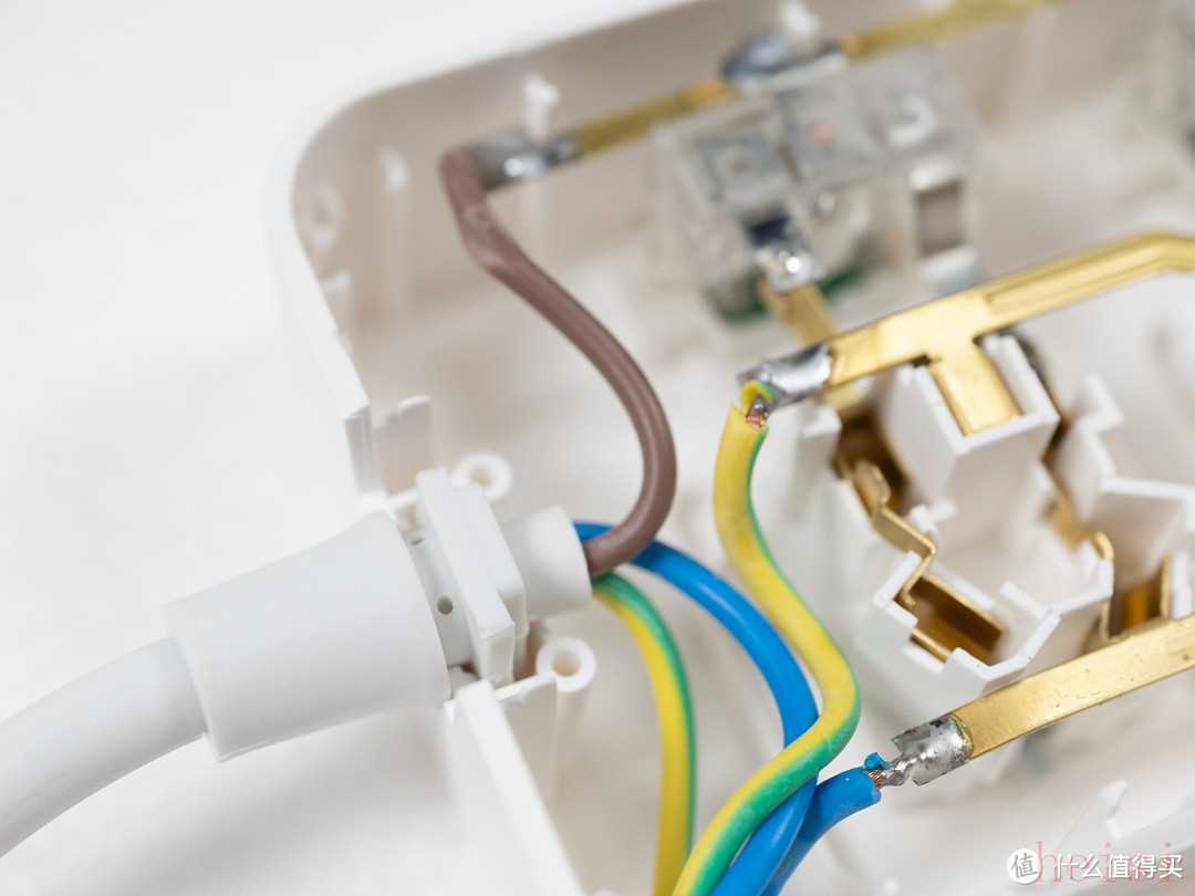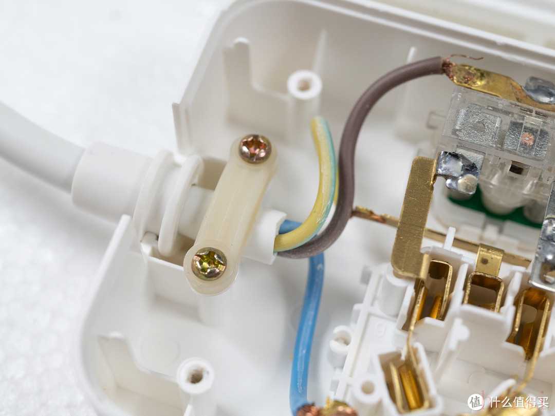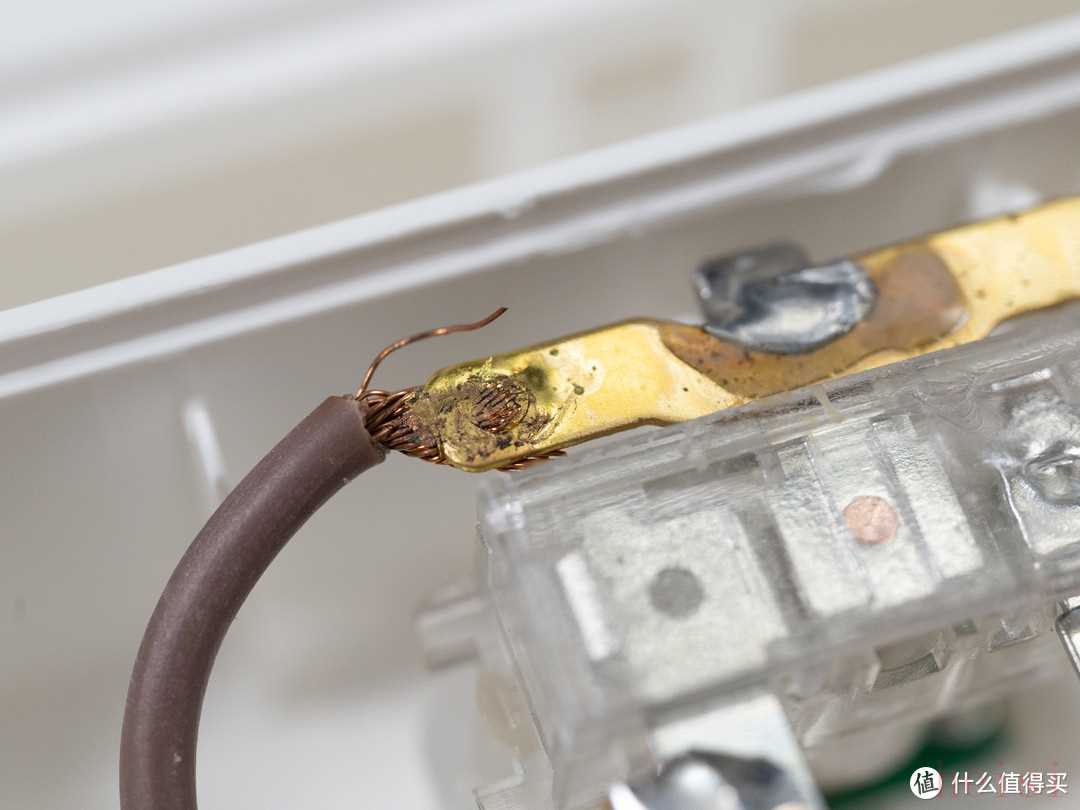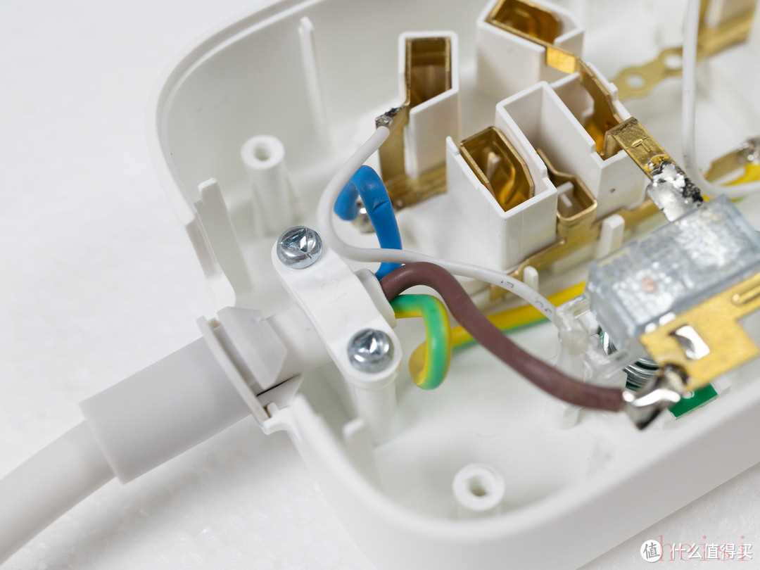 內(nèi)部做工還是比較一般般,沒(méi)有壓線(xiàn)蓋,僅僅是靠外殼進(jìn)行線(xiàn)纜的固定。注意到火線(xiàn)銅排有環(huán)形設(shè)計(jì),可是沒(méi)有壓槽。