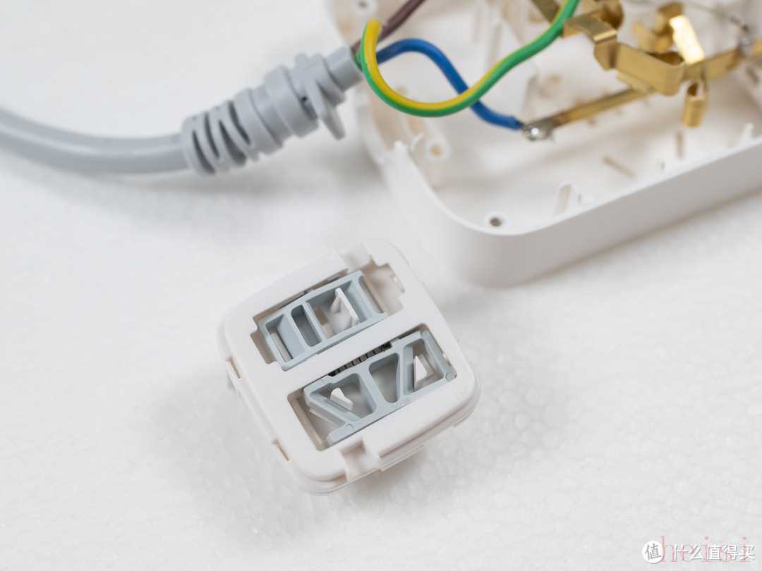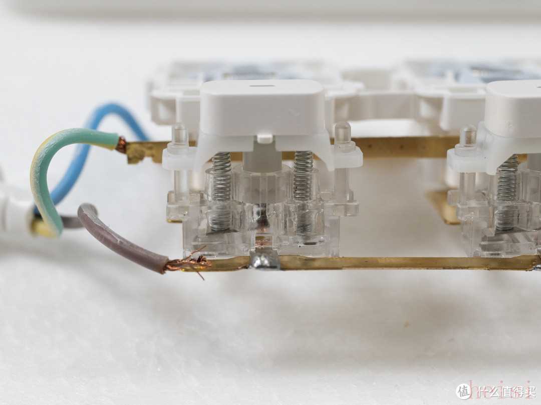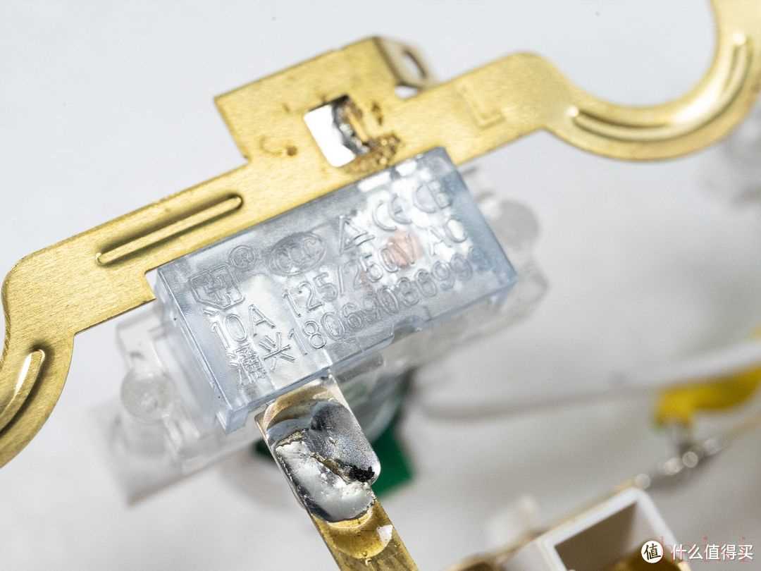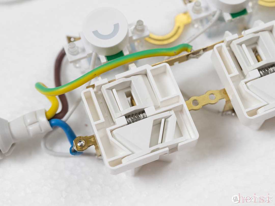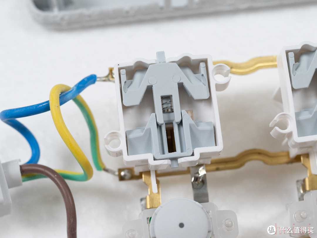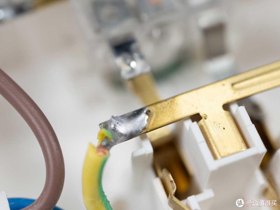 內(nèi)部做工還是比較一般般,沒(méi)有壓線(xiàn)蓋,僅僅是靠外殼進(jìn)行線(xiàn)纜的固定。注意到火線(xiàn)銅排有環(huán)形設(shè)計(jì),可是沒(méi)有壓槽。