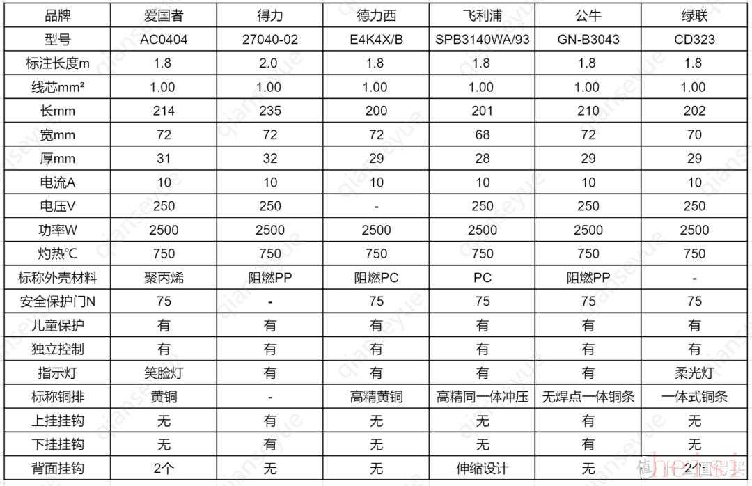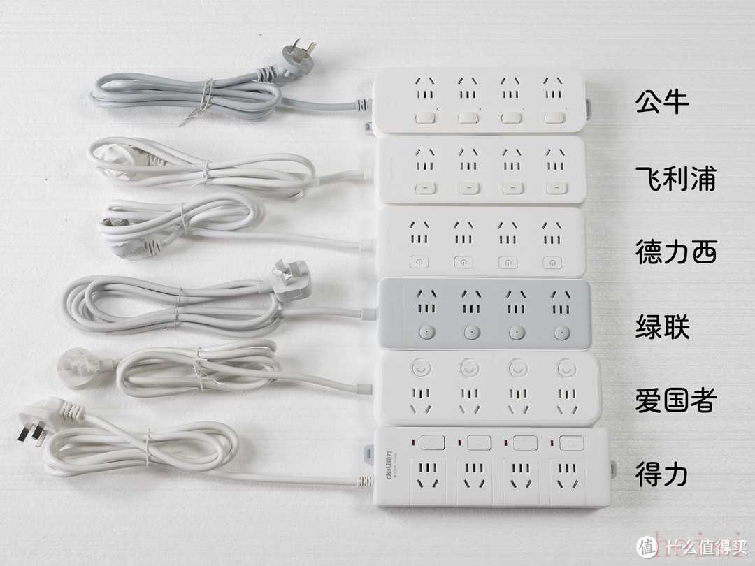 按照品牌首字母排序,分別有aigo AC0404、得力27040-02、德力西E4K4X/B、飛利浦SPB3140WA/93、公牛GN-B3043和綠聯(lián)CD323。