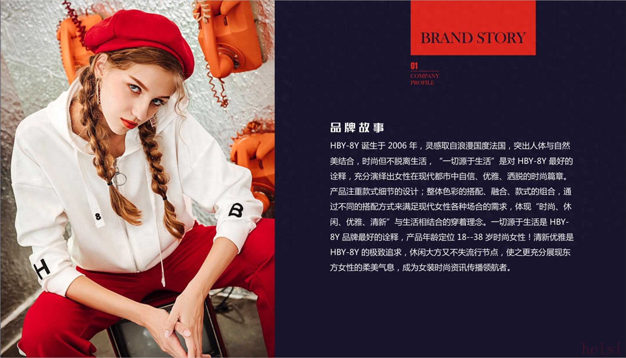HBY-8Y誕生于 2006年,靈感取自浪漫國度法國,突出人體與自然美結(jié)合,時(shí)尚但不脫離生活,"一切源于生活"是對(duì) HBY-8Y最好的詮釋,充分演繹出女性在現(xiàn)代都市中自信、優(yōu)雅、灑脫的時(shí)尚篇章。產(chǎn)品注重款式細(xì)節(jié)的設(shè)計(jì);整體色彩的搭配、融合、款式的組合,通過不同的搭配方式來滿足現(xiàn)代女性各種場(chǎng)合的需求,體現(xiàn)"時(shí)尚、休閑、優(yōu)雅、清新"與生活相結(jié)合的穿著理念。一切源于生活是 HBY-8Y品牌最好的詮釋,產(chǎn)品年齡定位18-38歲時(shí)尚女性!清新優(yōu)雅是HBY-8Y 的極致追求,休閑大方又不失流行節(jié)點(diǎn),使之更充分展現(xiàn)東方女性的柔美氣息,成為女裝時(shí)尚資訊傳播領(lǐng)航者。