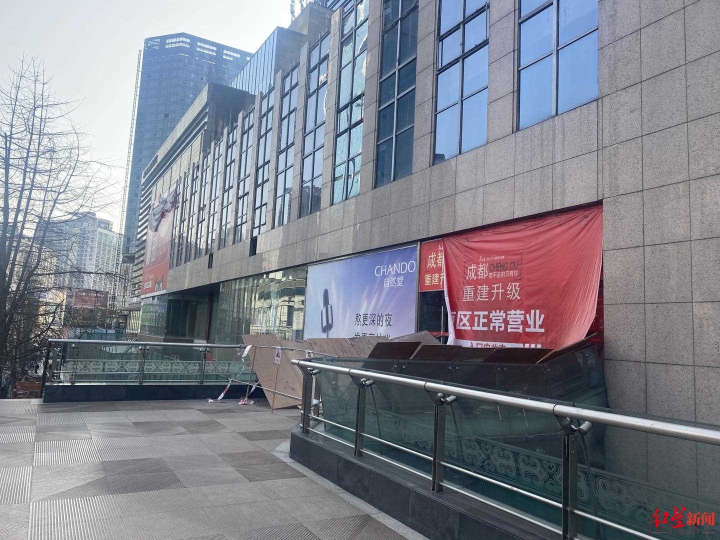 1月11日下午,紅星新聞?dòng)浾邅淼矫瘶I(yè)天地(鹽市口店)。商場(chǎng)北區(qū)的建筑已經(jīng)整體打圍,但建筑上標(biāo)志性的“茂業(yè)百貨”四個(gè)金色大字仍舊掛在外墻上。