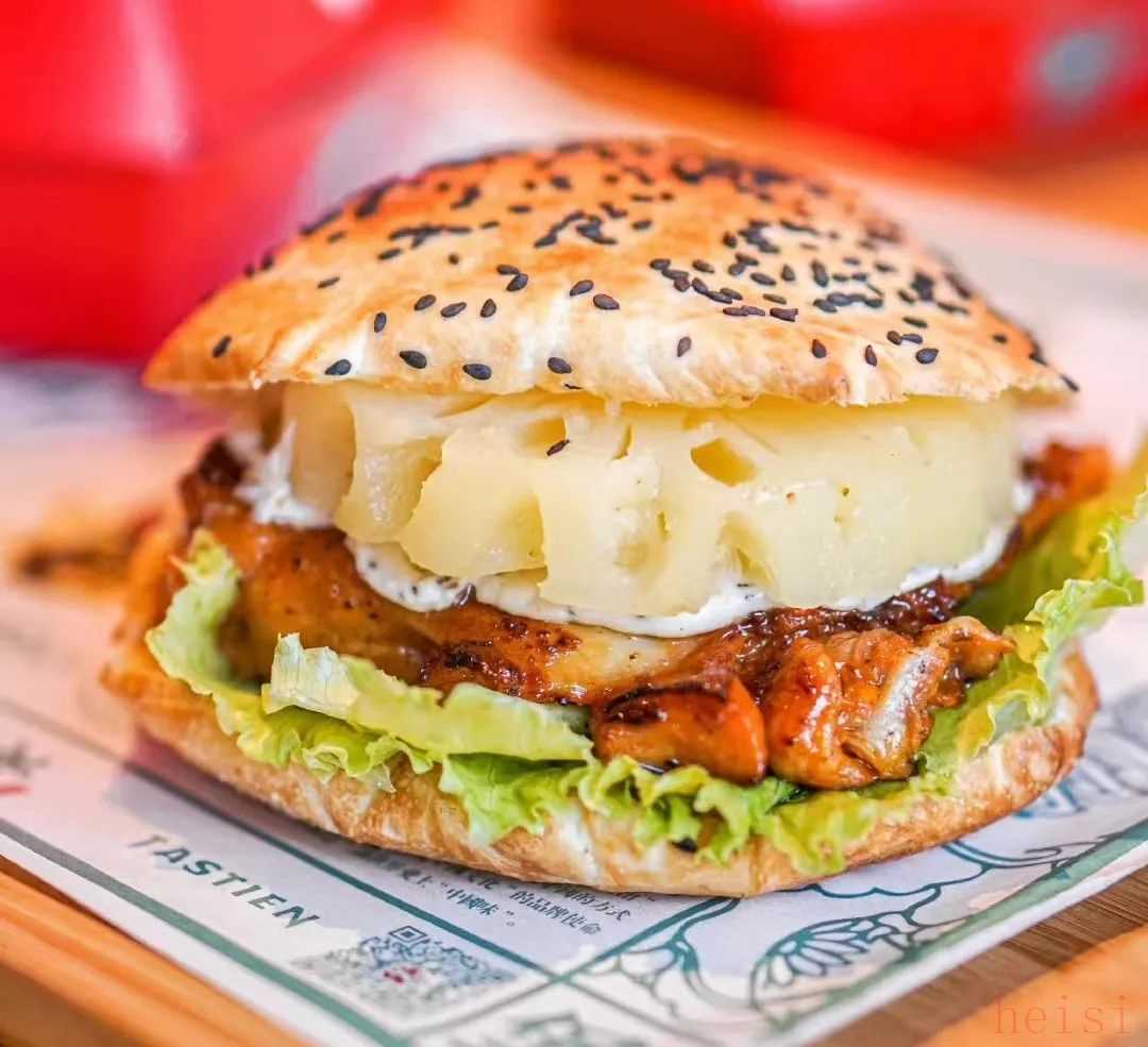 △圖片來源:小紅書截圖除了漢堡皮的創(chuàng)新外,中式漢堡的餡料與傳統(tǒng)的西式漢堡也有明顯差異。傳統(tǒng)的西式漢堡一般以火腿、牛肉、雞排等肉餡為主,中式漢堡的口味則更多元豐富,在傳統(tǒng)內(nèi)餡的基礎(chǔ)上,還可以夾北京烤鴨、梅菜扣肉、麻婆豆腐、龍蝦等,夾心配料也有羽衣甘藍(lán)、鳳梨等。