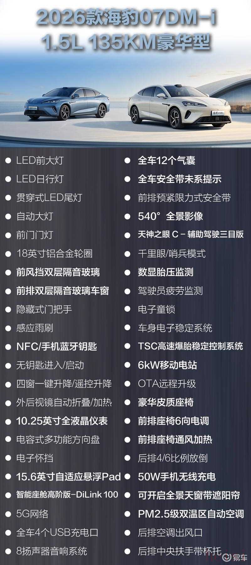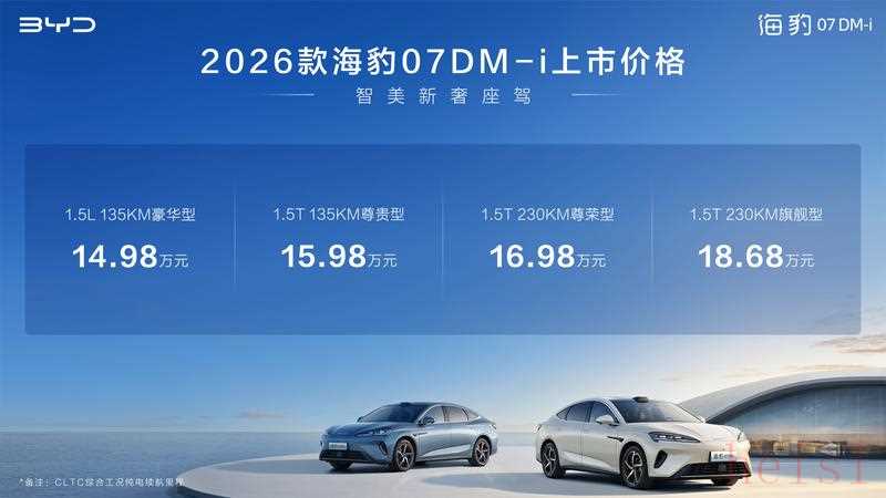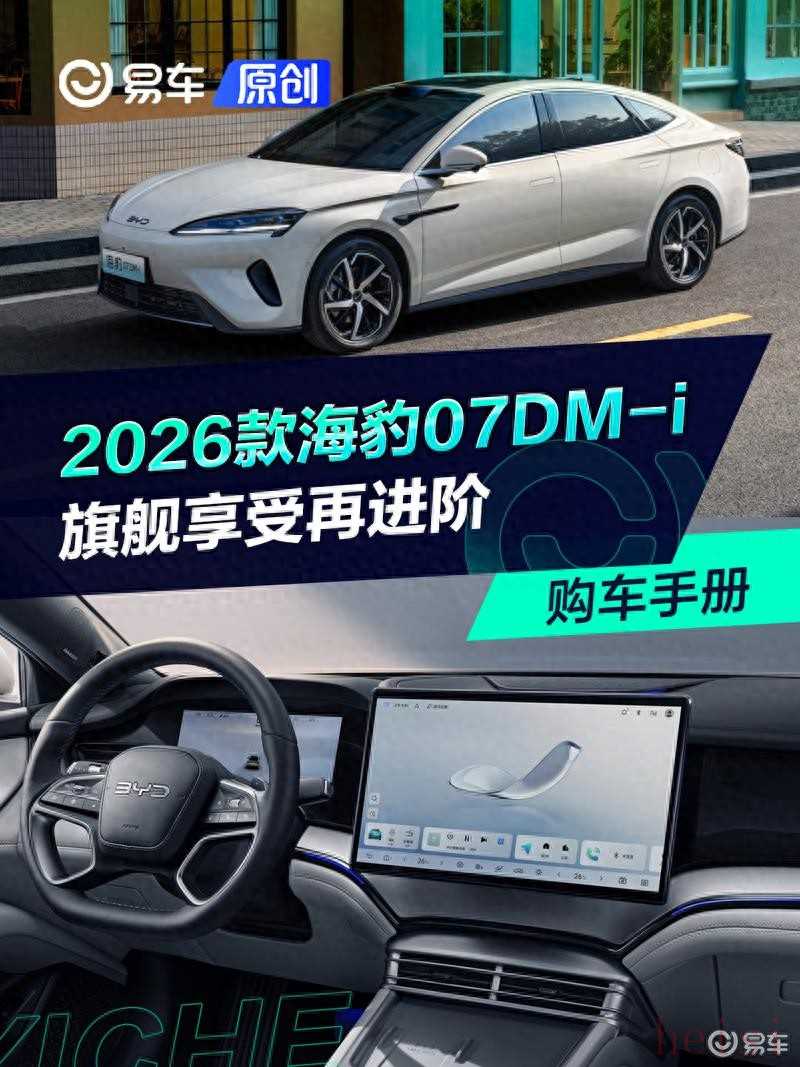 易車原創(chuàng)9月15日,2026款海豹07DM-i正式上市,售14.98萬(wàn)起,作為海洋網(wǎng)在中大型轎車市場(chǎng)的重磅力作,海豹07DM-i進(jìn)一步拓展了品牌的產(chǎn)品布局,完善了海豹IP的產(chǎn)品序列。新車基于全新一代插混整車平臺(tái)打造,采用全新海洋美學(xué)設(shè)計(jì)語(yǔ)言,新增云輦-C智能阻尼車身控制系統(tǒng)、智能冷暖冰箱等舒適配置、及搭載天神之眼 B - 輔助駕駛激光版(DiPilot 300)、智能座艙高階版-DiLink 100、以及超100項(xiàng)全系標(biāo)配,純電續(xù)航更是進(jìn)一步提升到230km。那么一款性價(jià)比極高的B+級(jí)插混旗艦轎車應(yīng)該怎么選呢?