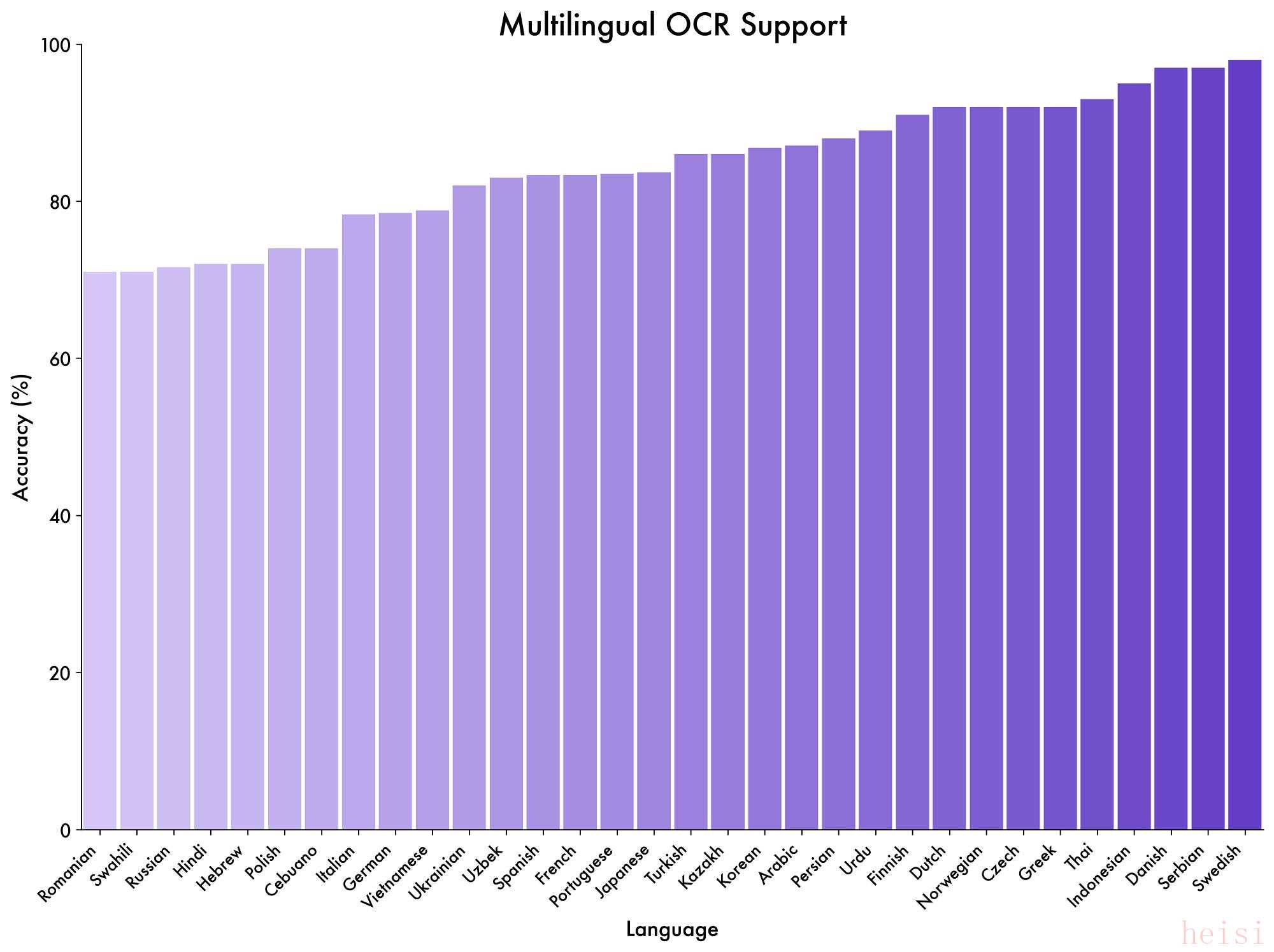 Qwen3-VL能識(shí)別的非中文、英文語言從10種擴(kuò)展到32種,覆蓋更多國家和地區(qū)。在這32種語言上,模型的識(shí)別準(zhǔn)確率已經(jīng)超過70%,達(dá)到實(shí)際可用水平。這些語言包括瑞典語等歐洲語言、斯瓦西里語等非洲語言、越南語等東南亞語言、印地語和烏爾都語等南亞語言和日語韓語等東亞語言,基本覆蓋了常用的小語種。