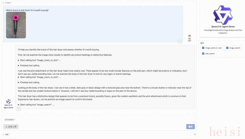 官方Demo中,僅需上傳一張吹風(fēng)機(jī)的圖片,模型就能主動(dòng)進(jìn)行圖像感知,并調(diào)用搜索工具,給出品牌等信息,并提供是否值得購買的建議。