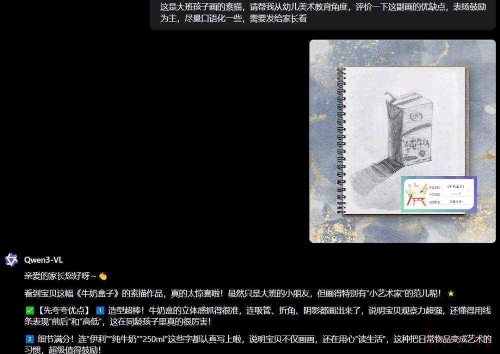 官方Demo展現(xiàn)了一個(gè)非常實(shí)用的Case,可以直接把孩子的素描作業(yè)發(fā)給Qwen3-VL,模型能根據(jù)畫面內(nèi)容和用戶提示詞,給出準(zhǔn)確的評價(jià)。