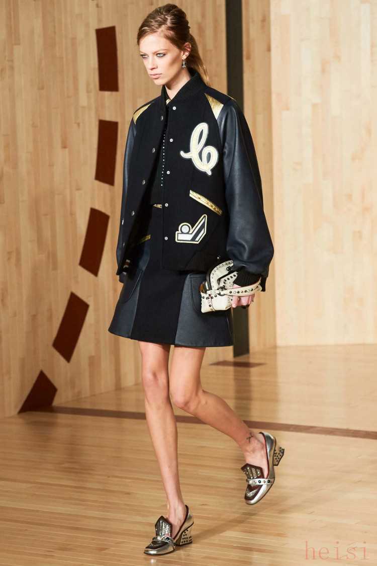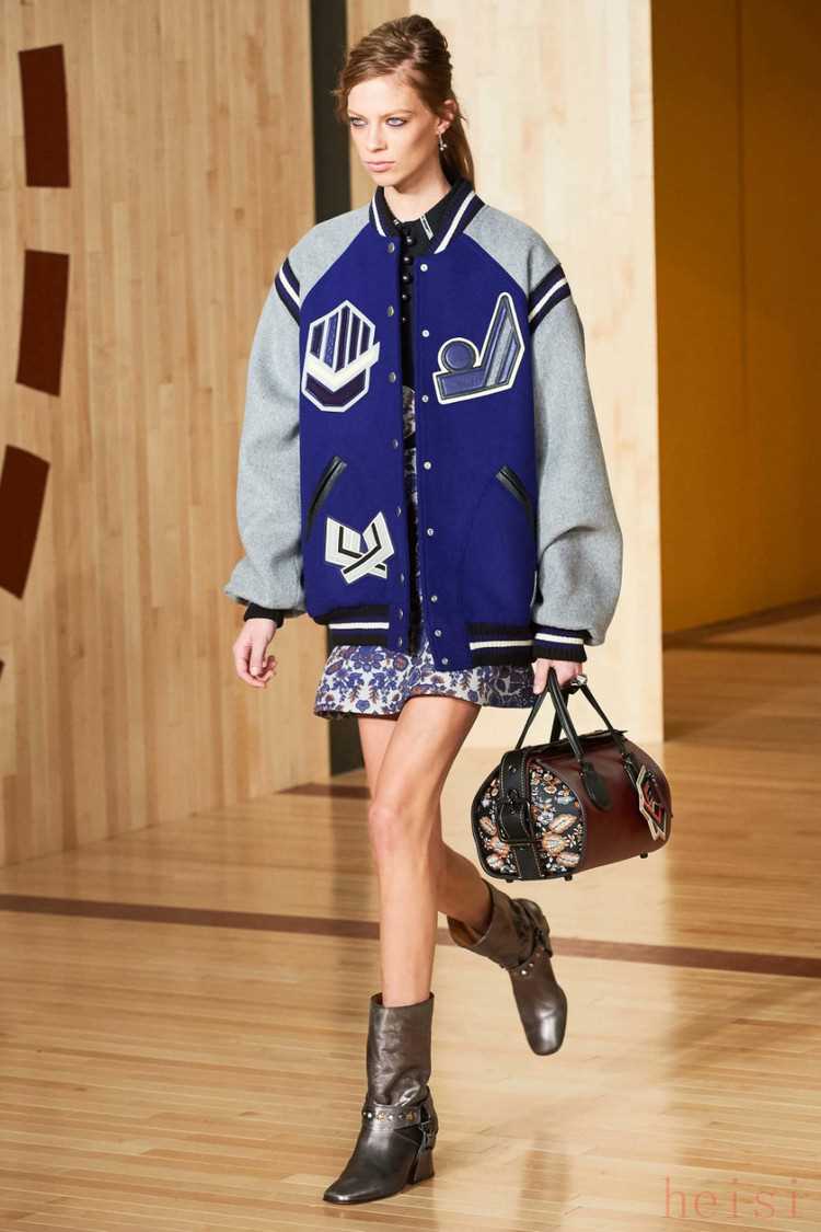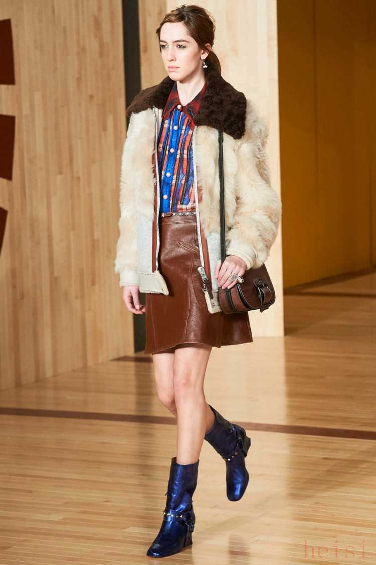特別亮點莫過于皮包、皮鞋、以及皮夾克衫,因為設計師Stuart Vevers來自西班牙著名皮具品牌Loewe,與這個老牌皮具品牌Coach可以說天作之合??鋸埖挠』?、有趣的拼色、機械感拉鏈,都運用的恰到好處。