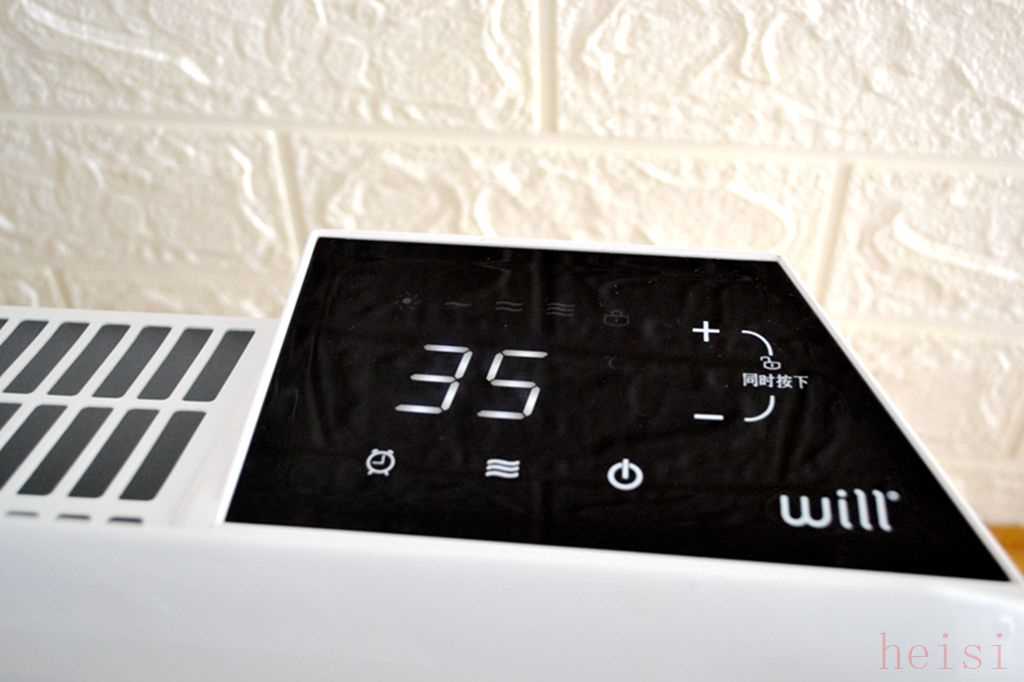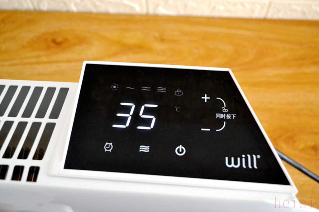 而家愿取暖器的按鍵和顯示器位于機(jī)身頂部的右側(cè)區(qū)域,不過(guò)家愿取暖器的顯示屏采用了一塊黑色LED觸摸顯示屏,可以調(diào)節(jié)高中低三檔功率,并且可以設(shè)定定時(shí)功能,同樣也支持童鎖鍵。