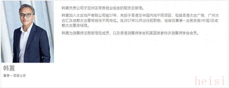 記者查閱太古地產(chǎn)高管資料發(fā)現(xiàn),韓置目前為太古地產(chǎn)零售業(yè)務(wù)董事,負(fù)責(zé)亞洲區(qū)的零售物業(yè)組合的租賃及管理。在2017年11月出任現(xiàn)職前,曾任董事-業(yè)務(wù)發(fā)展(中國)及成都太古里總經(jīng)理。