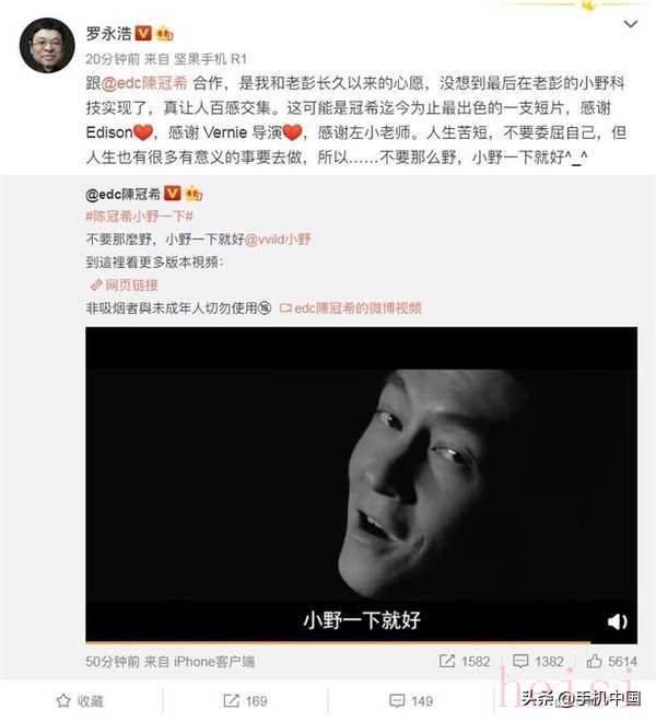 那么這個(gè)“大活”到底是啥?現(xiàn)在答案已經(jīng)揭曉。8月27日,陳冠希微博發(fā)布了自己代言小野電子煙所拍攝的廣告片。羅永浩也兌現(xiàn)了幾個(gè)月前所說的話,并轉(zhuǎn)發(fā)陳冠希的微博,先是表示自己和陳冠希的合作終于算是了了一樁心愿,但沒想到是在小野這個(gè)平臺(tái)上實(shí)現(xiàn),讓人百感交集。然后就是一通感謝,感謝了所有參與制作廣告片的人。“小野一下就好”。