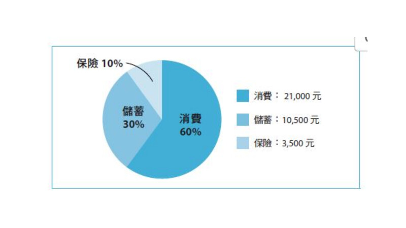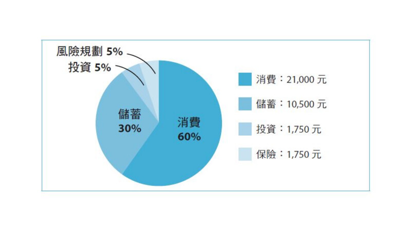 這個比例是根據(jù)前面的631法則延伸的彈性調(diào)整,稍微降低風(fēng)險規(guī)劃(保險)的比例,挪到投資去,60%消費、30%儲蓄、5%投資、5%風(fēng)險規(guī)劃。一樣用月薪35000元分配,比例會是這樣:
