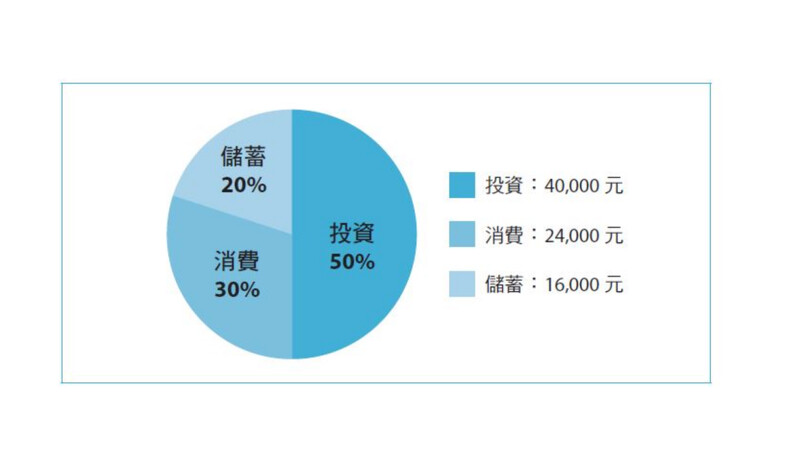 不過這個法則是設(shè)定給收入較高的族群,每個月的消費比例可以往下調(diào)降,別因為賺得多就花更多,收入提高了,不就正好是投資和儲蓄的好機會嗎?假設(shè)以月薪8萬來分配比例的話: