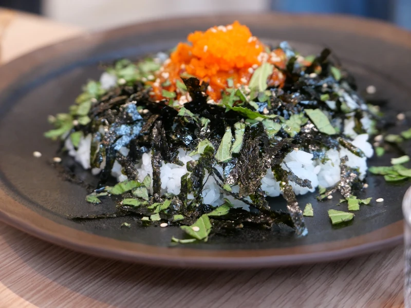 吃完馬鈴薯排骨火鍋后也別急著結(jié)帳,因為只要點鍋再加兩道菜,就會有只送不賣的,全程將由店員桌邊服務(wù),利用鍋底剩下的精華湯汁與白飯快速拌炒,再加入老泡菜、海苔絲與飛魚卵,當(dāng)鐵鍋滋滋作響香氣散發(fā)出來,就是最佳品嚐時間,還帶有一點點脆得恰到好處的鍋巴,即便飽到不行還是忍不住多扒幾口。