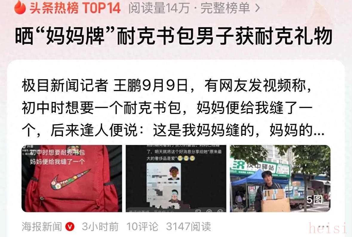 視頻發(fā)布者劉先生回憶,初中時渴望擁有耐克書包,媽媽因家庭經(jīng)濟(jì)原因拒絕后,偷偷在他書包上縫了耐克標(biāo)志,還繡上小花綠葉。然而,年少的他因同學(xué)嘲笑“盜版”,將書包藏進(jìn)衣柜。多年后翻出書包,劉先生體會到媽媽的良苦用心,分享的視頻收獲近千萬點贊 。耐克官方溫情回應(yīng),準(zhǔn)備禮物并私信聯(lián)系,獲超260萬點贊,被贊“教科書級公關(guān)”,目前劉先生已經(jīng)收到耐克官方的回贈禮品。