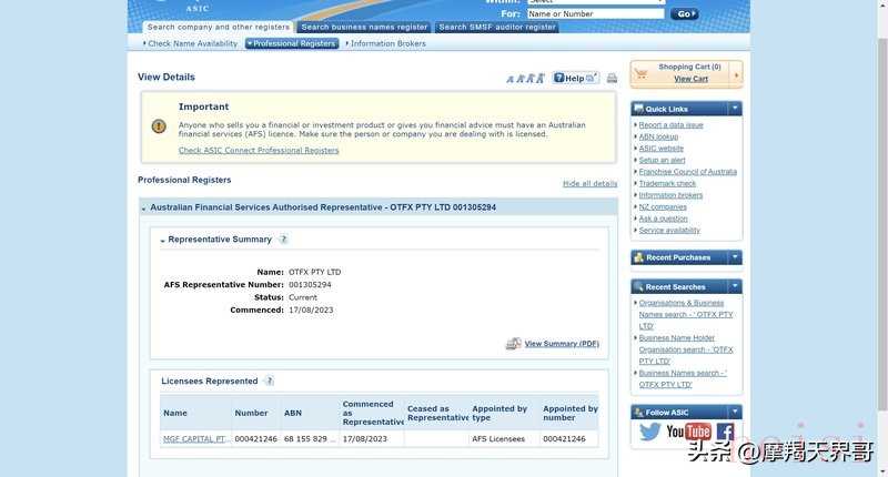 通過上圖,我們可以看到,OTFX歐匯于2023年8月17日從MGF CAPITAL PTY LTD獲得了澳大利亞授權(quán)代表(AR)許可。