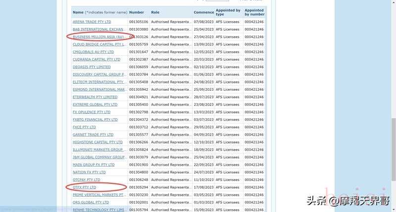 然而,問題在于MGF CAPITAL PTY LTD本身沒有零售外匯交易的授權(quán),因此他們無法發(fā)布此類授權(quán),此外,經(jīng)過深入調(diào)查,發(fā)現(xiàn)MGF CAPITAL PTY LTD主要專門發(fā)放澳大利亞AR許可證,以協(xié)助欺詐集團(tuán)進(jìn)行詐騙。通過在澳大利亞ASIC網(wǎng)站上的專業(yè)搜索(如下圖所示),可以看出MGF CAPITAL PTY LTD已向30多家欺詐公司頒發(fā)了授權(quán),其中包括臭名昭著的龐氏騙局,如BMA(BUSINESS MILLION ASIA),OTFX歐匯也位于這30多家公司之一。