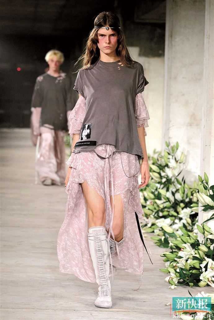 曾一度只用于新娘造型或?qū)m廷造型的蕾絲,新近展示出更前衛(wèi)、個(gè)性的姿態(tài),設(shè)計(jì)師們不再滿足單一面料質(zhì)感,將目光投向更為多元的材質(zhì)融合,將蕾絲與絲綢、皮革、牛仔、西裝等面料拼接,以強(qiáng)烈質(zhì)感對比營造視覺反差。