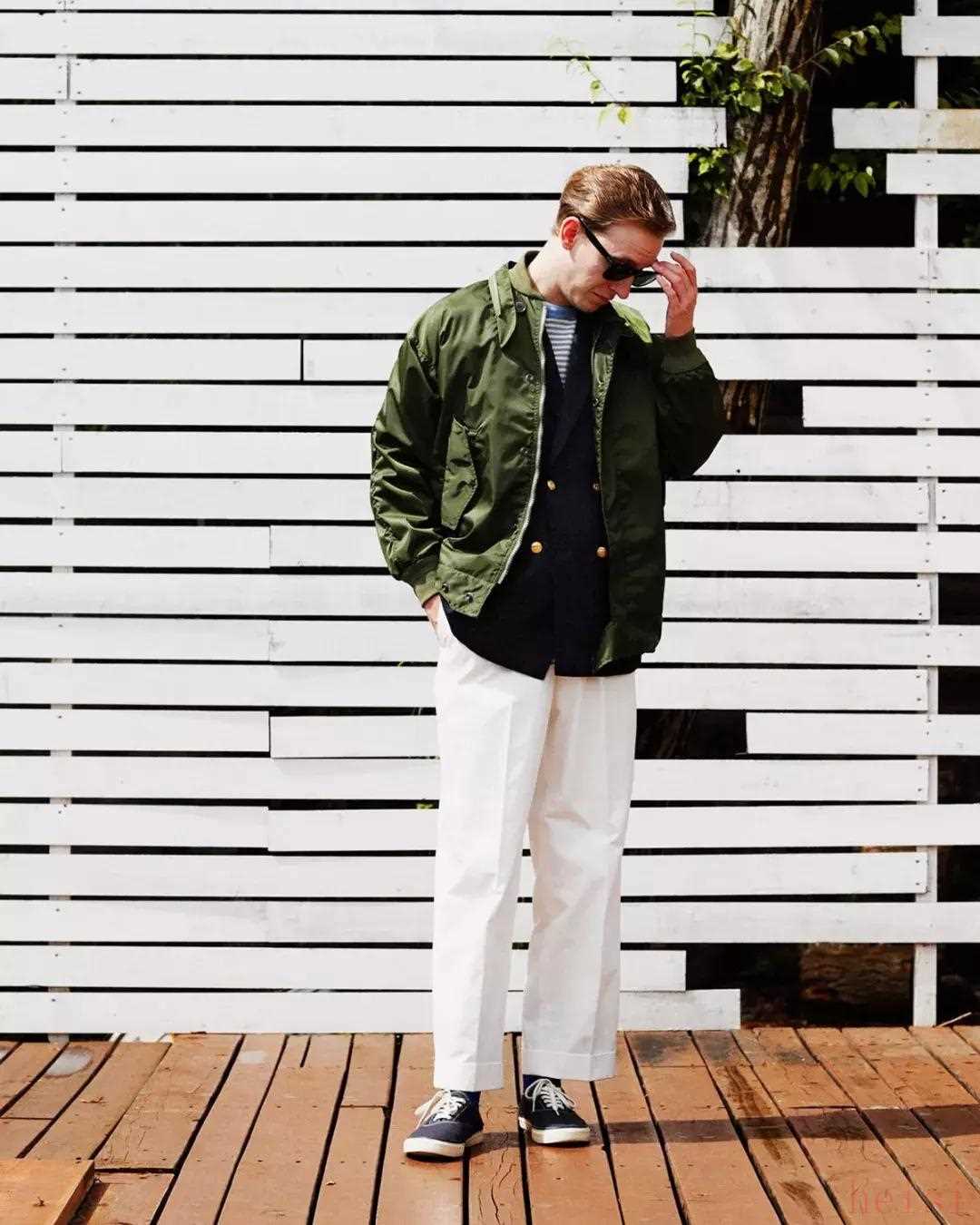 加上內(nèi)搭的白T+藍(lán)白間條紋衫于領(lǐng)部的點(diǎn)綴,造型的完成度提高了不少。比起單穿 Blazer,它在一定程度上緩和了日?;齑钌系臎_突感,這點(diǎn)也是與大多日本復(fù)古品牌一樣備受大眾喜愛的地方。